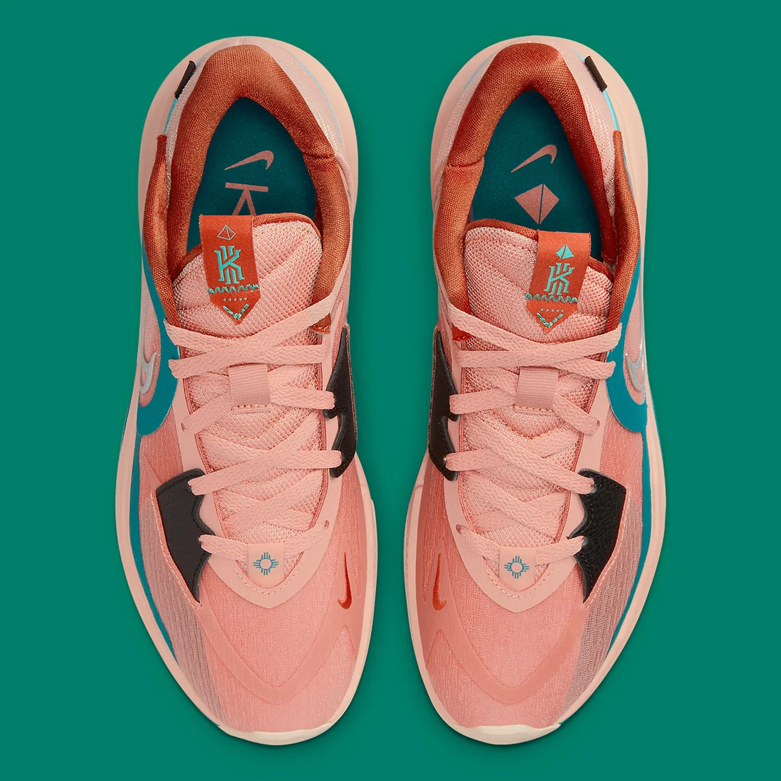 Après mars et avril, voici le troisième modèle présenté, alliant différentes teintes de rose saumon, allant jusqu’au orange sur la languette sur laquelle figure le logo de Kyrie Irving en bleu ciel. La paire est assortie de bandes en vert émeraude et dispose d’un renfort en cuir acajou foncé qui remonte jusqu’aux œillets au bas des lacets.