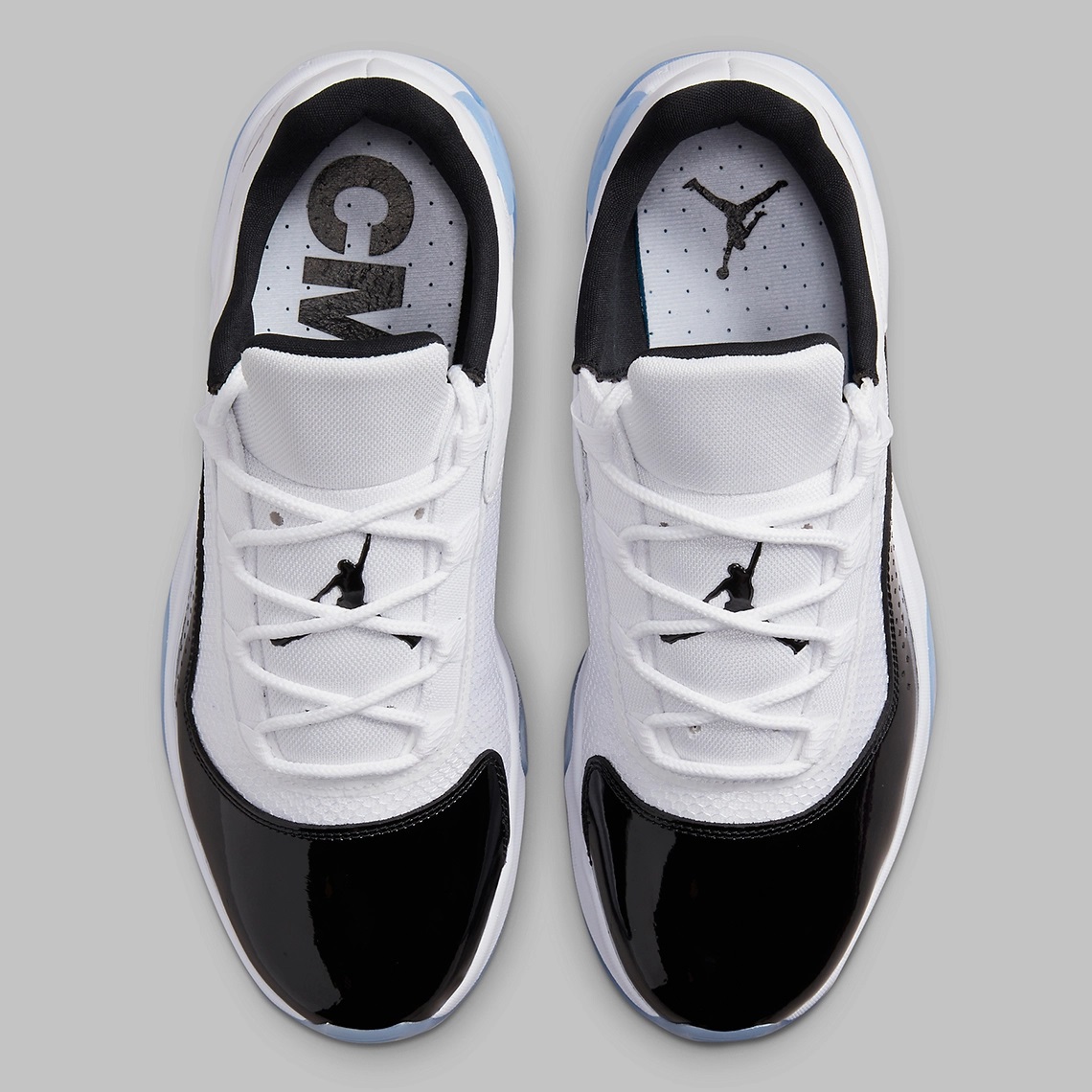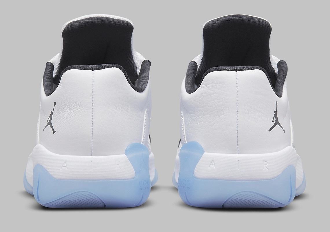 Sa particularité réside dans la base de sa tige recouverte d’une bande en cuir verni noir « piano », pour accompagner la partie en cuir blanc et nylon balistique. Le modèle est assorti de deux logos « Jumpman » ressortant en noir et d’une semelle extérieure en bleu translucide glacé.