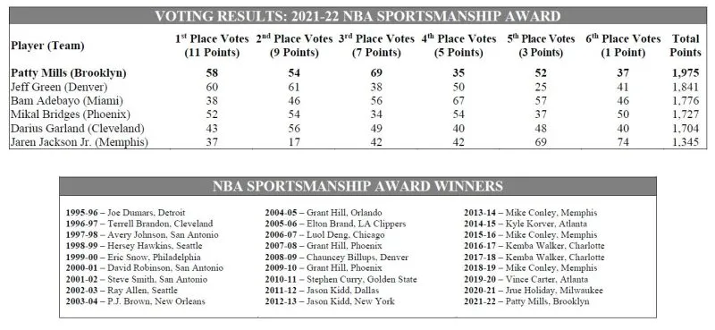 Comme chaque année depuis 1996, la NBA décerne son Sportsmanship Award au joueur qui « représente le mieux les valeurs du sport sur le terrain, le comportement éthique, le fair-play et l’intégrité ». Il porte le nom de Joe Dumars, premier vainqueur et reconnu pour son côté gentleman des parquets.
