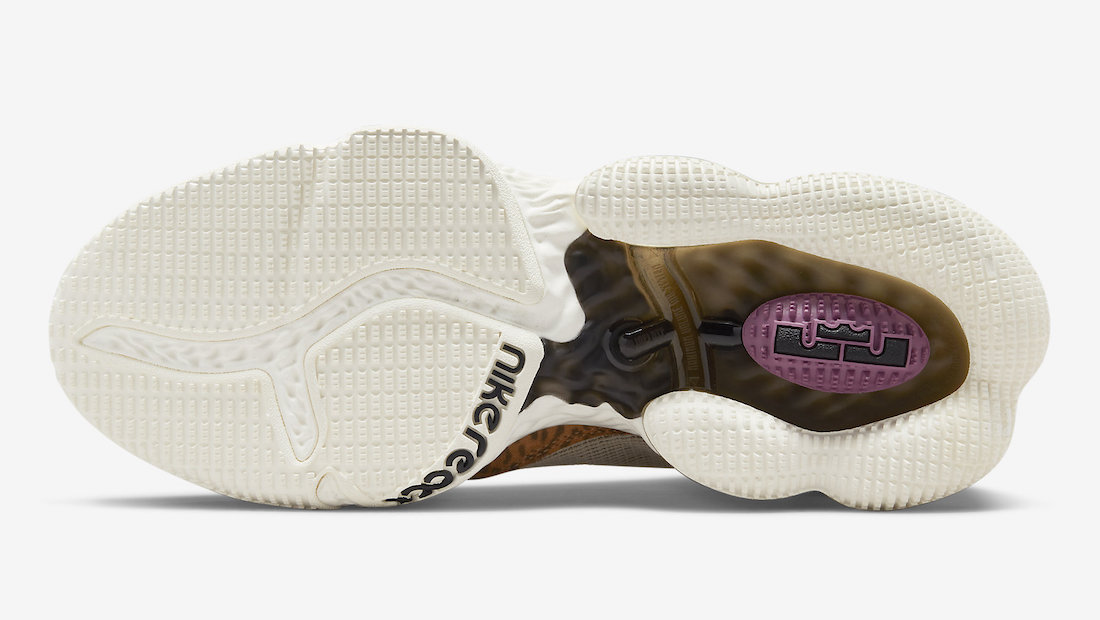 L’ensemble est complété par un « Swoosh » bleu sur la semelle intermédiaire en mousse React blanche, et des finitions en noir et violet. Le logo de LeBron James apparaît en noir sur fond rouge sur la languette.