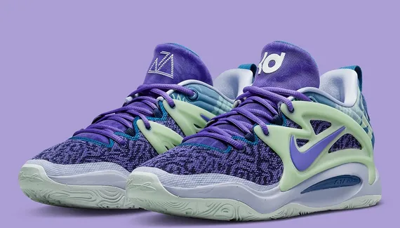 Ça commence avec ce mix « Purple-Marina Blue », doté d'un imprimé violet et noir sur la tige, une languette et des lacets également en violet, une touche de vert citron sur l’empeigne laissant ressortir un « swoosh » violet.