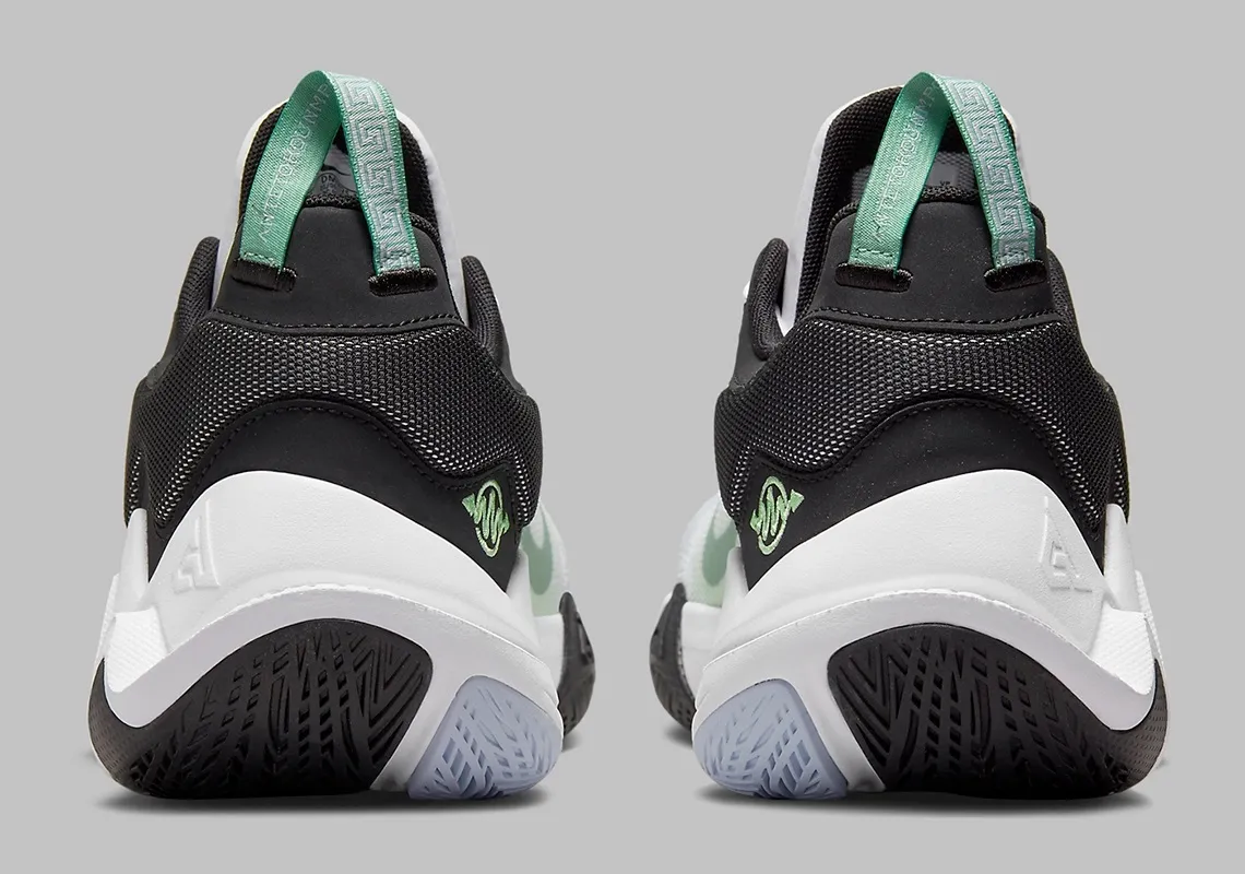 Dernier en date, ce modèle à la tige blanche à l’avant, assorti par du noir sur la partie du talon. L’ensemble est contrasté par deux notes de « volt » et un vert plus sombre, faisant penser aux couleurs des Bucks, pour faire ressortir les logos du joueur sur la languette, le « swoosh » sur l’empeigne et la tirette.