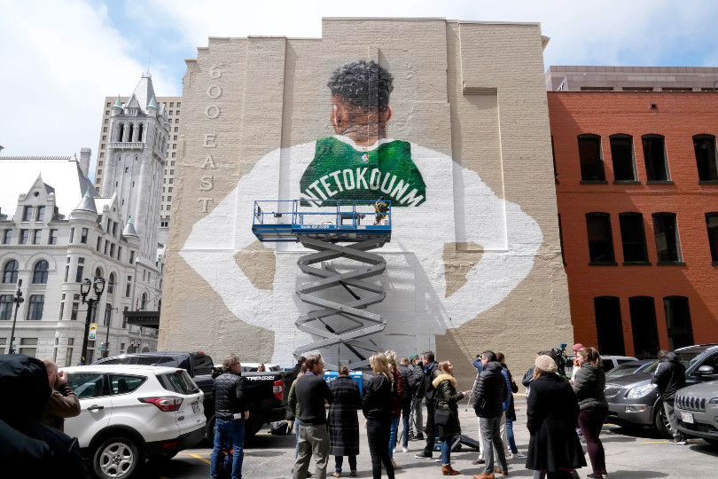 Depuis plusieurs jours, les habitants de Milwaukee peuvent apprécier l’évolution d’une fresque géante en l’honneur de Giannis Antetokounmpo, au 600 East Wisconsin Avenue, sur l’une des façades du bâtiment 600 EAST.