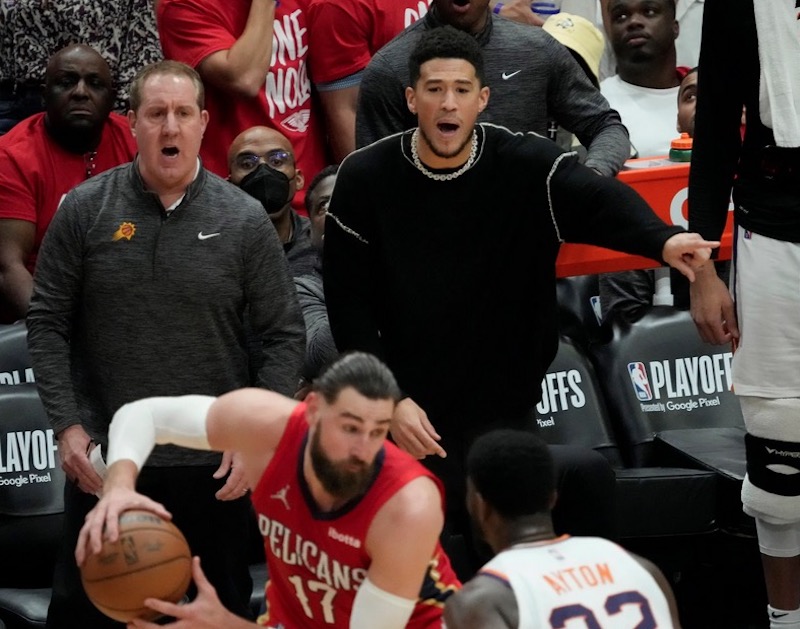 Lors du premier tour face aux Pelicans, Devin Booker a fait parler de lui pour ses performances sur le terrain ainsi qu’aux abords de ce dernier. Dans le Game 5, l’arrière, en civil avec sa blessure aux ischio-jambiers, était carrément sorti de son banc pour dire deux mots aux arbitres après une faute offensive sifflée à l’encontre de Deandre Ayton. Monty Williams et lui avaient obtenu gain de cause car les officiels étaient revenus sur leur décision initiale avec un « challenge » gagnant.