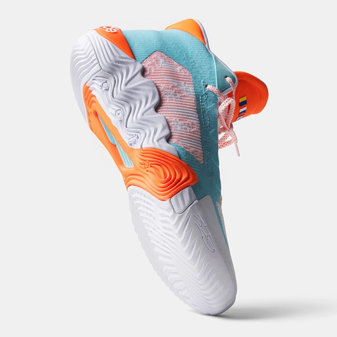 La majeure partie de la tige apparaît en bleu clair, avec des notes de blanc à l’avant. Des touches d’orange viennent compléter l’ensemble, sur le talon, la languette et la semelle, principalement blanche, sur laquelle on aperçoit la signature du joueur. Des drapeaux présents sur la languette représentent un clin d’œil au monde de la voile. Enfin, l’inscription New Balance ressort en blanc sur fond orange à la base du talon.