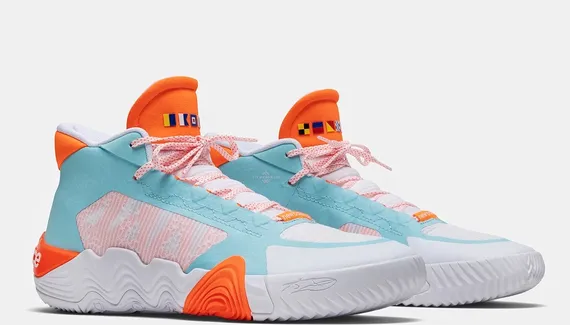 La majeure partie de la tige apparaît en bleu clair, avec des notes de blanc à l'avant. Des touches d'orange viennent compléter l'ensemble, sur le talon, la languette et la semelle, principalement blanche, sur laquelle on aperçoit la signature du joueur. Des drapeaux présents sur la languette représentent un clin d’œil au monde de la voile. Enfin, l'inscription New Balance ressort en blanc sur fond orange à la base du talon.
