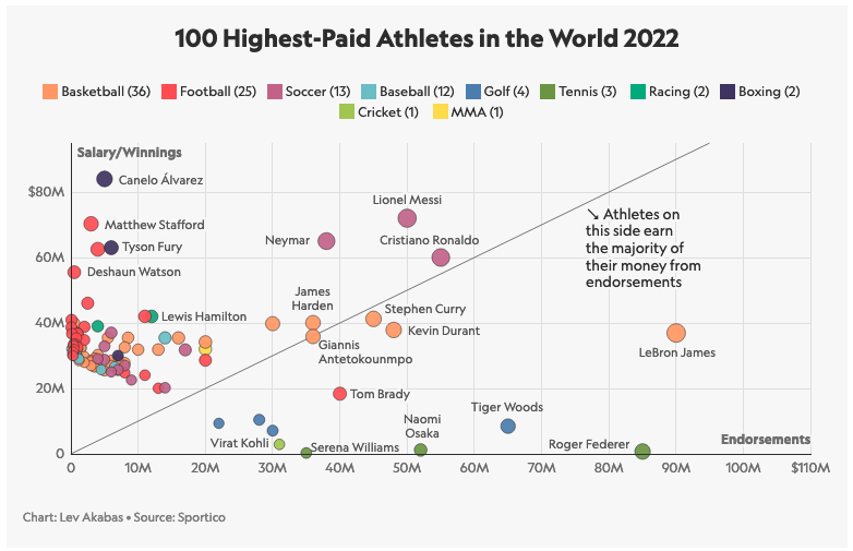 Pour faire son classement sur l’année fiscale (qui se termine mi-avril aux Etats-Unis), Sportico a listé les salaires mais aussi les contrats de sponsoring. Grâce à ses 200 millions de fans sur les différents réseaux sociaux, le “King” peut ainsi faire la promotion de ses sponsors traditionnels, mais aussi de ses propres marques, comme Calm, Ladder/Openfit ou la téquila Lobos 1707. Le sponsoring lui a ainsi rapporté 90 millions de dollars cette année, et en ajoutant son salaire de 36.9 millions de dollars, on atteint quasiment 127 millions de dollars.