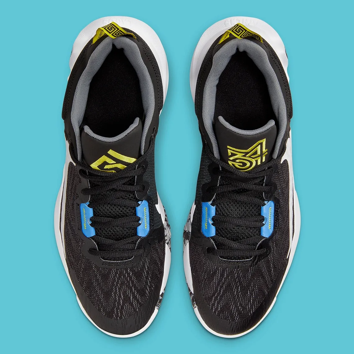 En attendant, Nike continue de proposer de nouveaux coloris d’un modèle censé sortir au cours de l’été. On est cette fois sur une version plutôt standard en noir et blanc pour habiller la tige, avec deux virgules ressortant en blanc. Des accents en bleu ciel et des finitions dorées complètent l’ensemble sur la tirette, le logo et le numéro de Giannis Antetokounmpo recouvrant la languette.