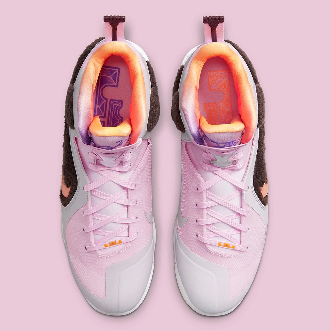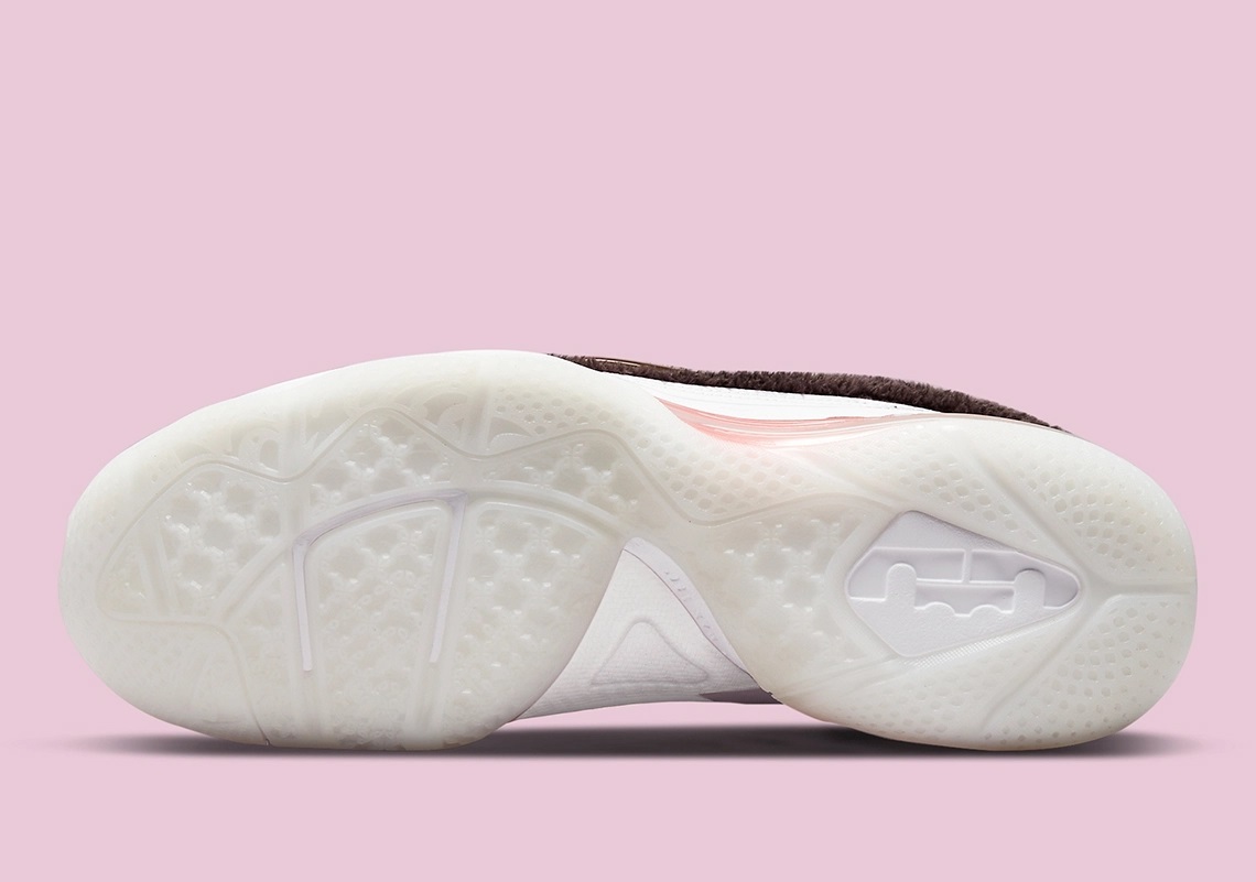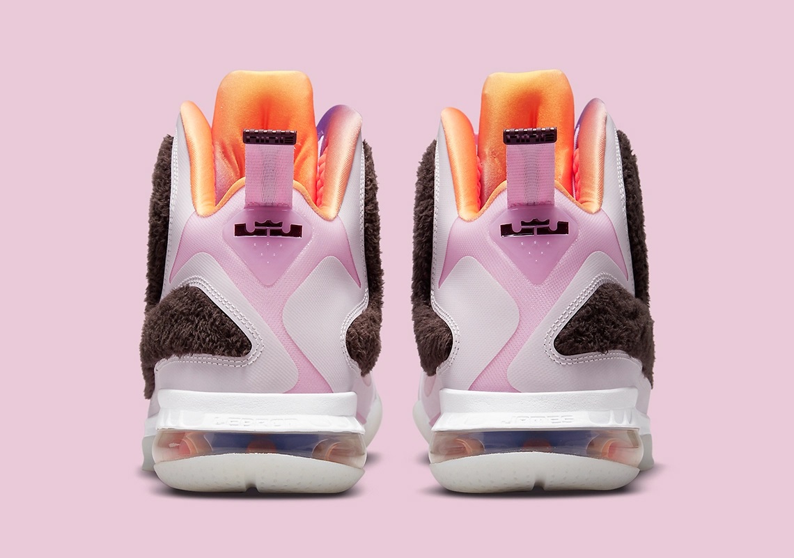 La tige se présente en effet en rose et gris, avec une grosse partie en fourrure marron pour entourer un « swoosh » doré également imposant. Les signatures sur la languette apparaissent en violet tandis que le col offre un dégradé d’orange à doré jusqu’au violet.