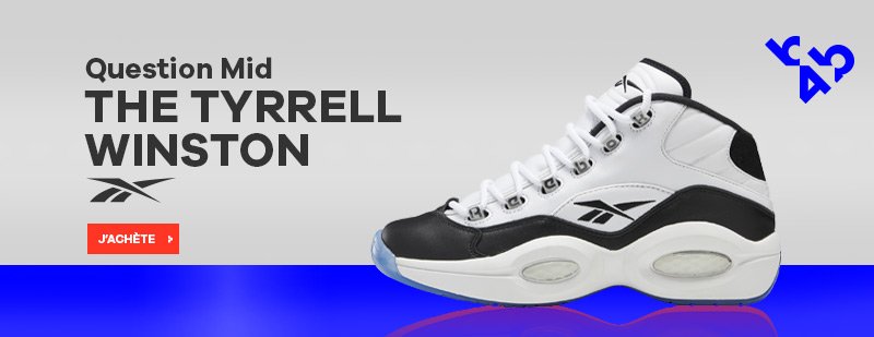 Commande sur basket4ballers.com la chaussure retro basketball Reebok Question Mid imaginée en collaboration avec Tyrrell Winston, célèbre pour ses œuvres d’art et fan de basketball vintage. Livraison et retour offert.