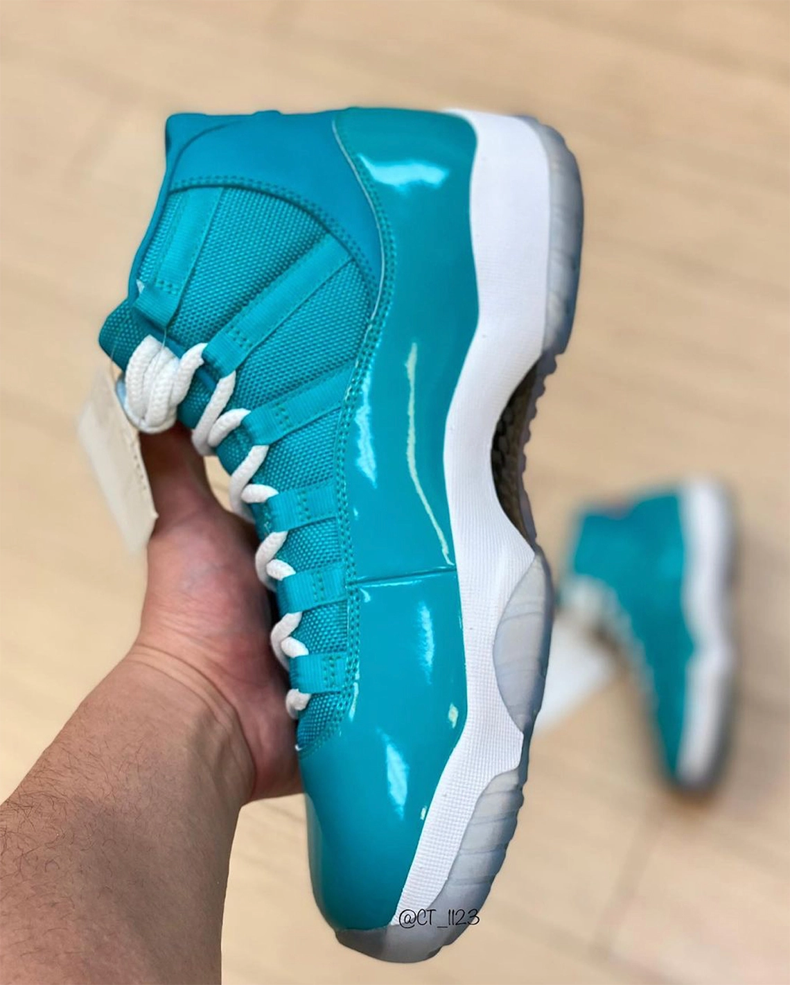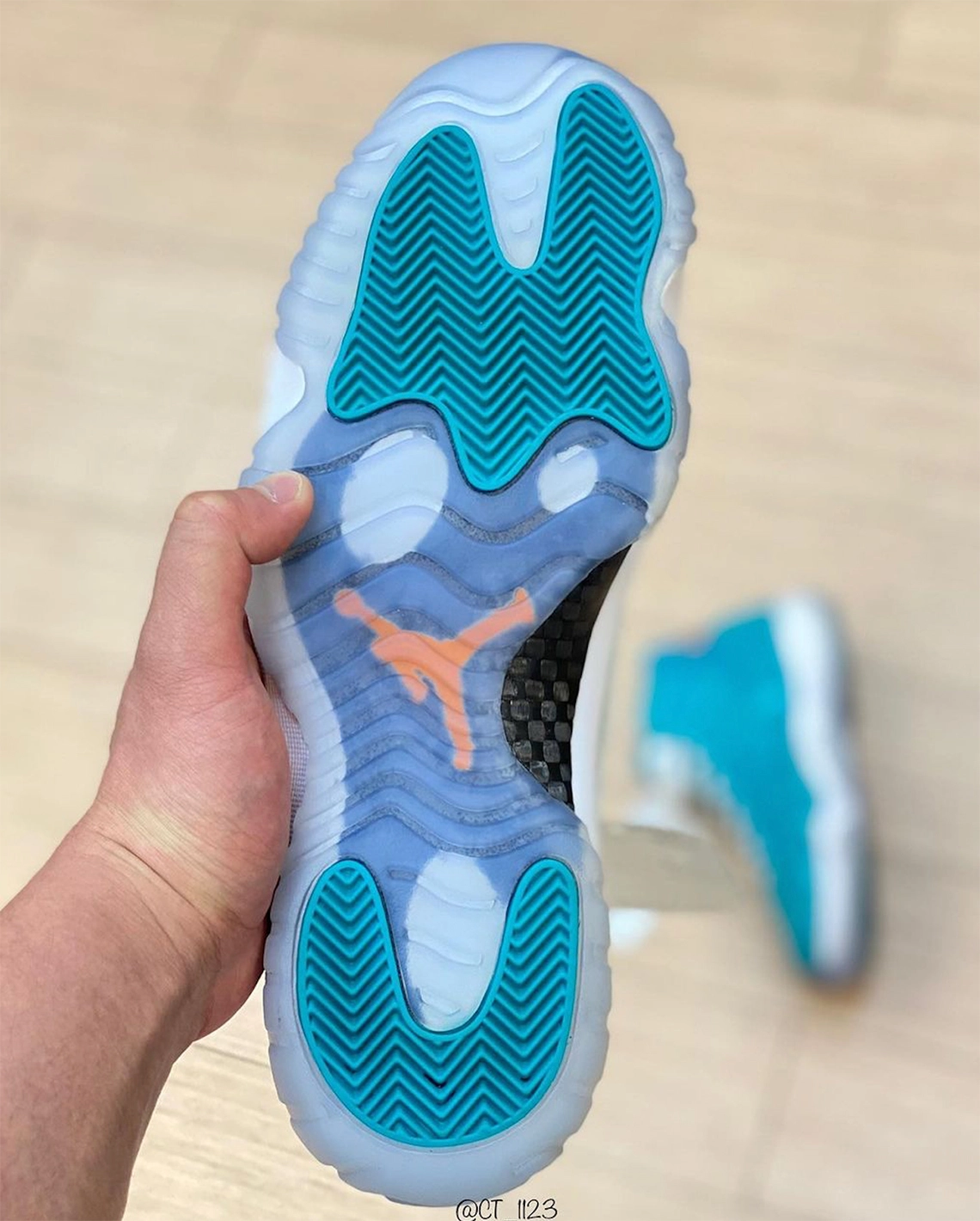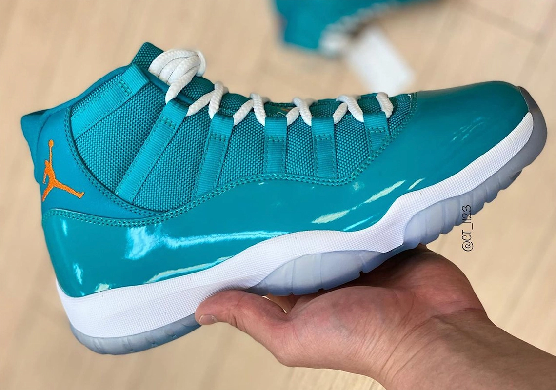 Cette fois, la tige en mesh balistique et en cuir verni ressort entièrement en bleu « océan » avec une touche d’orange, sur le « Jumpman » présent au niveau du talon et au milieu des lacets qui apparaissent pour leur part en blanc. L’association fait évidemment penser aux couleurs des Dolphins de Miami (NFL).