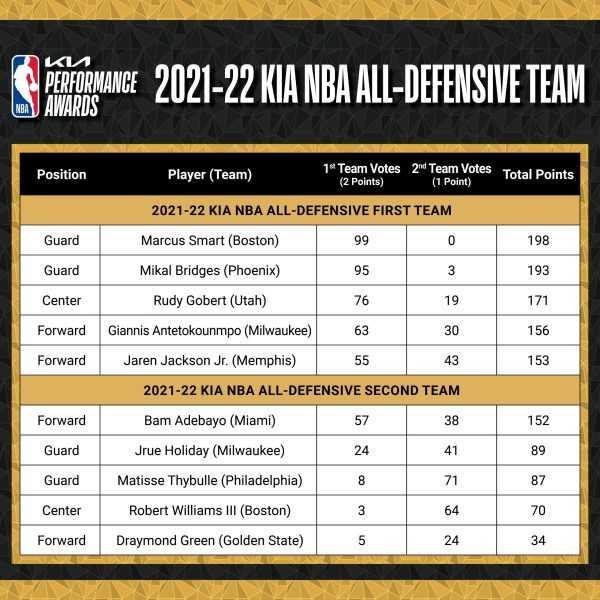 La « All-Defensive Second Team » est quant à elle composée de Jrue Holiday (Bucks, 89 points), Matisse Thybulle (Sixers, 87 points), Draymond Green (Warriors, 34 points), Bam Adebayo (Heat, 152 points) et Robert Williams (Celtics, 70 points).