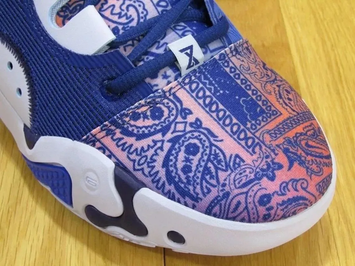 Les motifs « paisley » présents sur l’avant de la chaussure et la languette rappellent également les codes vestimentaires des Crips. La tige majoritairement bleue repose sur une semelle extérieure blanche, assortie de touches également bleues sur la mousse React notamment. De quoi jouer au basket et danser le « Crip Walk » entre deux paniers ?