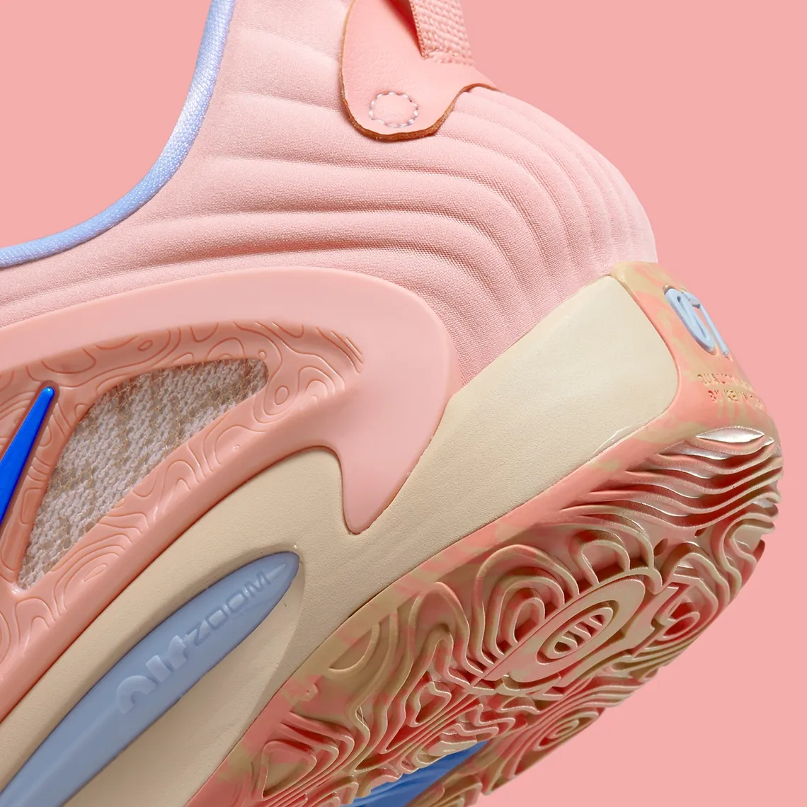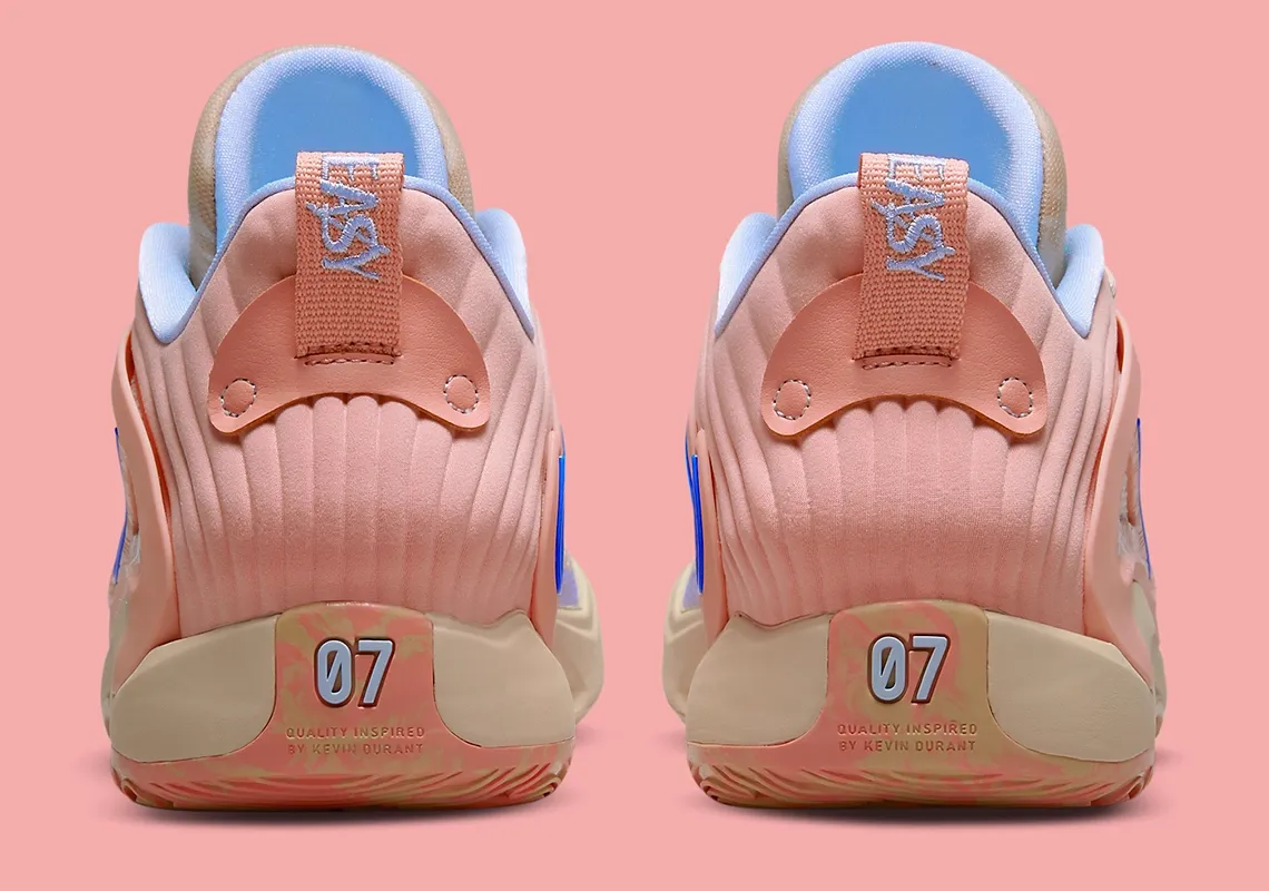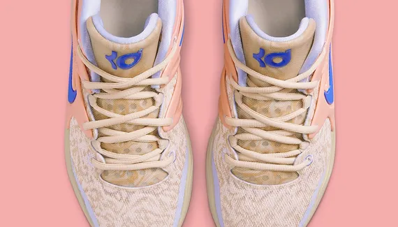 Et de cinq ! La marque à la virgule en est déjà au cinquième coloris dévoilé pour sa KD 15, qui ne dispose pas encore de date de sortie officielle. La nouvelle déclinaison « Royal Pink » offre cette fois une teinte inédite, avec une tige beige et blanche recouverte par du rose sur l’empeigne, où le « Swoosh » ressort en bleu.