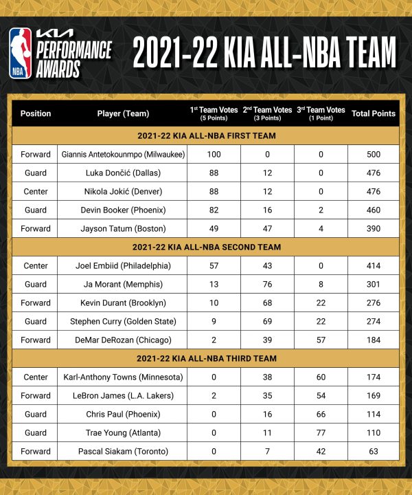 Meilleure équipe de la ligue en saison régulière, les Suns sont les seuls à placer plusieurs de leurs représentants dans l’une de ces « All-NBA Teams ». Meilleure équipe de la conférence Est, le Heat n’en place de son côté aucun.