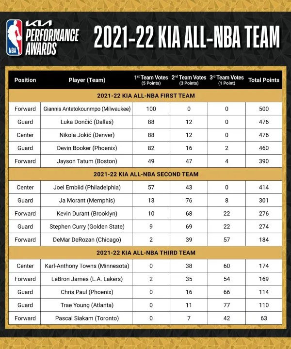Au rayon des anecdotes, on constate que Giannis Antetokounmpo est le seul joueur à avoir été unanimement retenu dans la « All-NBA First Team ». En effet, le MVP Nikola Jokic a dû partager les votes avec Joel Embiid, pour la place de pivot du meilleur cinq. Pourtant, ils étaient tous les deux éligibles dans la catégorie “forward” cette année, mais les votants ont opté pour une configuration classique.