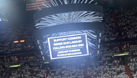 “Le Heat vous invite à contacter les sénateurs de votre État au 202-224-3121 pour laisser un message demandant leur soutien à des lois sensées sur les armes à feu”, a-t-il déclaré sous les applaudissements, alors que le numéro de téléphone s’affichait sur l’écran géant de la salle. “Vous pouvez également changer les choses dans les urnes. Visitez heat.com/vote pour vous inscrire et faire entendre votre voix cet automne.”