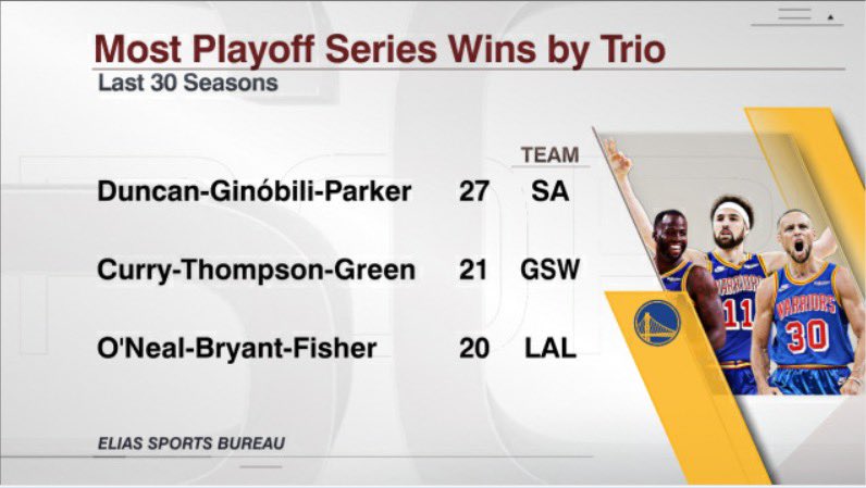Depuis 30 ans, un seul trio fait mieux et c’est évidemment du côté de San Antonio qu’il faut le trouver : Tony Parker, Manu Ginobili et Tim Duncan avaient gagné 27 séries de playoffs entre 2002 et 2016.