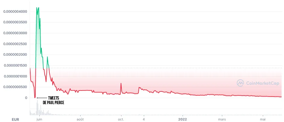 Lorsqu'il a posté ses tweets, le 26 mai 2021, les tokens EthereumMax ne valaient quasiment rien, mais grâce à la promotion de Paul Pierce et de Kim Kardashian, notamment, leur valeur a explosé en quelques heures, passant de moins de 0,000000000001 à 0,0000004184 dollar en deux jours. Difficile de voir ce que ça représente à l'échelle d'un token, mais lorsqu'on en a 15 billions, soit 15 million de millions (15 000 000 000 000), ça fait passer la valeur totale des actifs d'environ 15 dollars à plus de 6 millions de dollars…