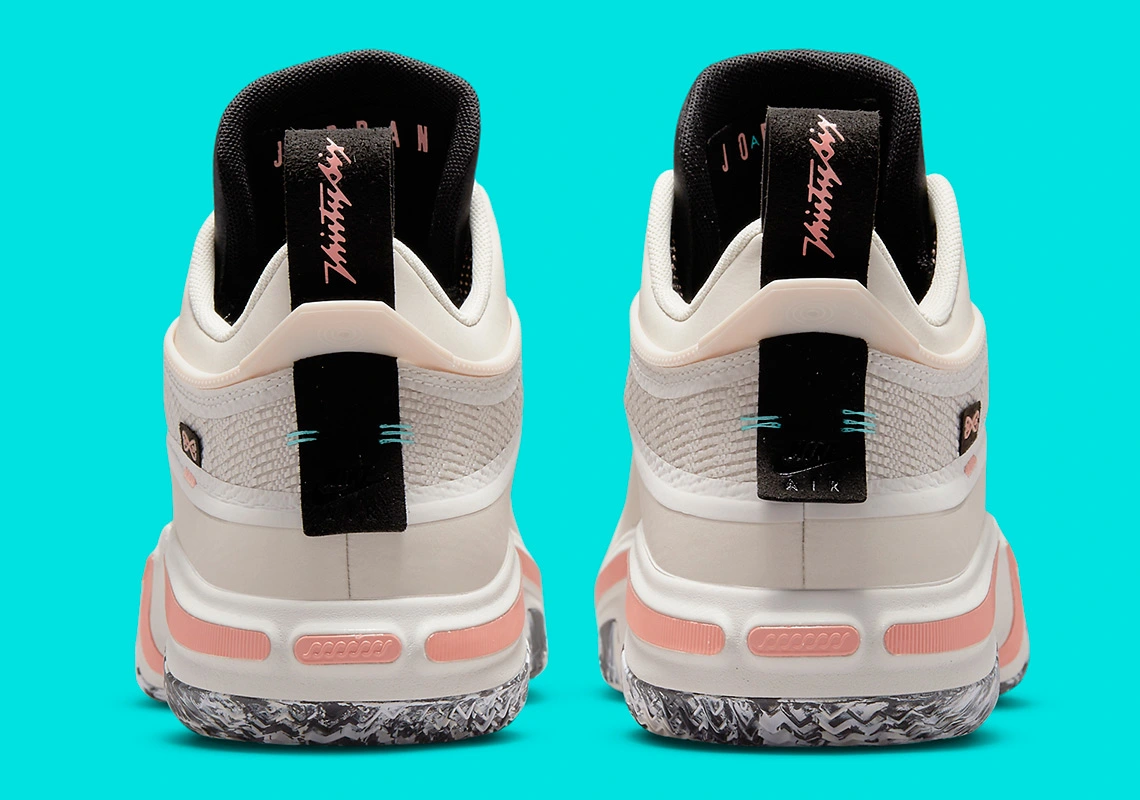 Baptisé « Light Orewood Brown », il se présente avec une tige en blanc nacré. La languette et la tirette sont en noir tandis que les finitions comme les logos « Jumpman » ou le ruban traversant la semelle ressortent en rose pâle. Avec quelques touches de bleu clair, on note aussi la semelle extérieure en version « marbrée » en noir et blanc.