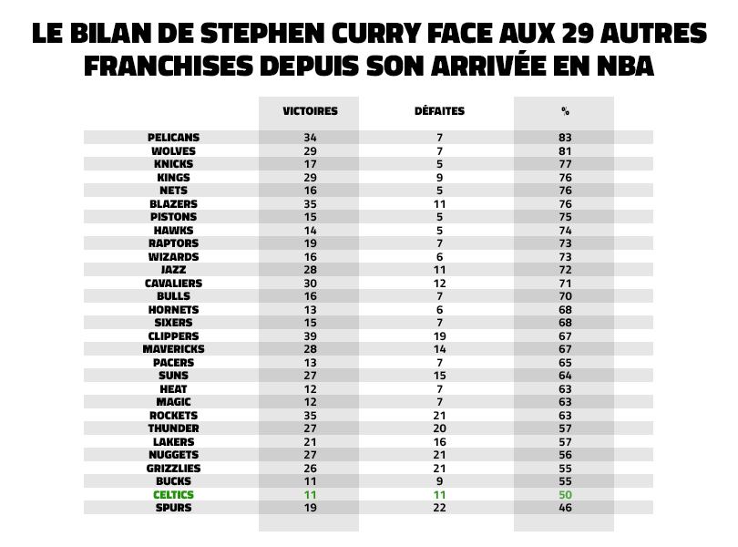 Surtout qu’historiquement, les Celtics sont sans doute l’équipe qui a posé le plus de problèmes aux Warriors de Stephen Curry. Hormis les Spurs, qui dominaient Golden State pendant les premières années du “Splash Brother” (4 victoires pour 16 défaites face aux Texans jusqu’en 2014, 15 victoires pour 6 défaites depuis), c’est en effet contre Boston que le meneur de jeu affiche le pire bilan depuis son arrivée dans la Grande Ligue.