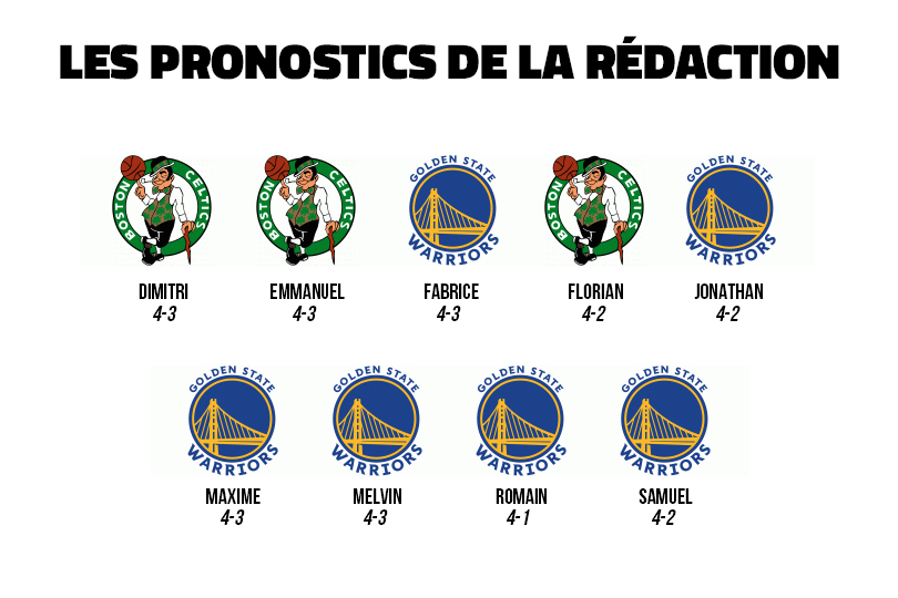 Stephen Curry et Golden State veulent continuer d’écrire leur légende. Jayson Tatum et Boston veulent entrer dans celle des Celtics. Ces Finals divisent notre rédaction avec un équilibre qui penche légèrement pour les Warriors. Cinq des neuf votants voient cependant cette série aller en sept matchs. L’affiche fait cependant l’unanimité et nous avons de hâte de connaitre le successeur des Bucks. Bonnes Finals !