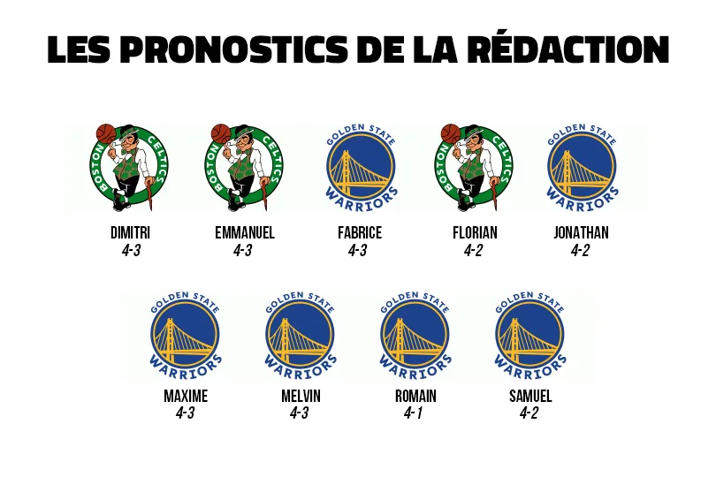 Stephen Curry et Golden State veulent continuer d'écrire leur légende. Jayson Tatum et Boston veulent entrer dans celle des Celtics. Ces Finals divisent notre rédaction avec un équilibre qui penche légèrement pour les Warriors. Cinq des neuf votants voient cependant cette série aller en sept matchs. L'affiche fait cependant l'unanimité et nous avons de hâte de connaitre le successeur des Bucks. Bonnes Finals !