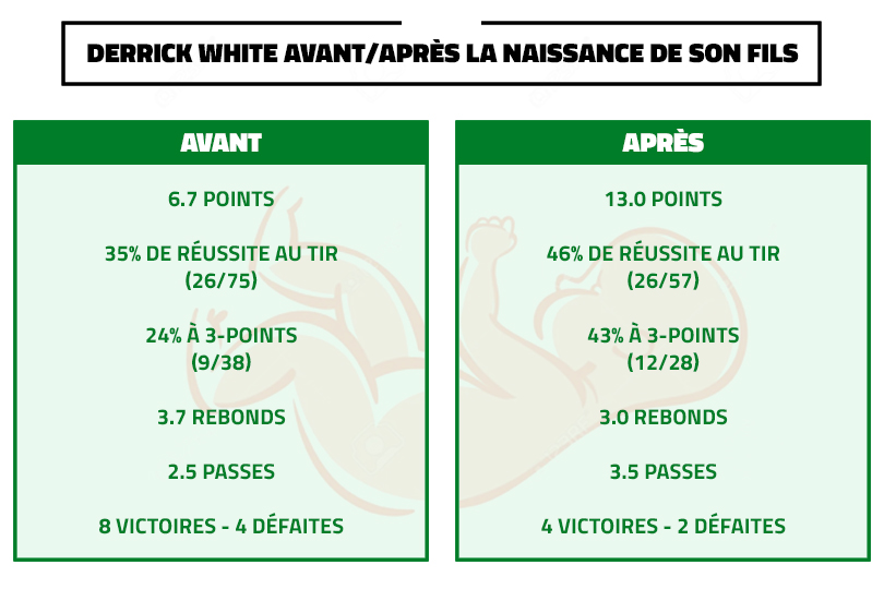 Derrick White est en train de connaître un effet similaire, même si un peu moins impressionnant. Précieux défensivement mais maladroit, il a ainsi retrouvé de l’adresse depuis la naissance de son fils, Hendrix.