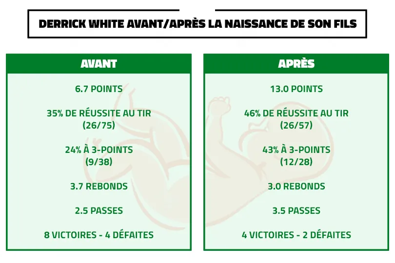 Derrick White est en train de connaître un effet similaire, même si un peu moins impressionnant. Précieux défensivement mais maladroit, il a ainsi retrouvé de l'adresse depuis la naissance de son fils, Hendrix.