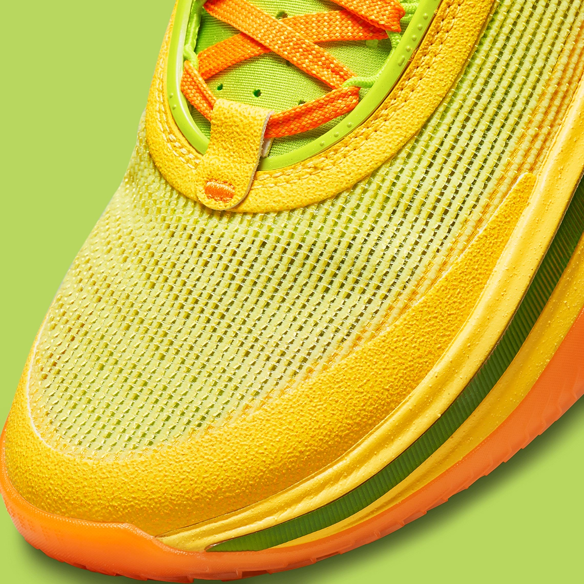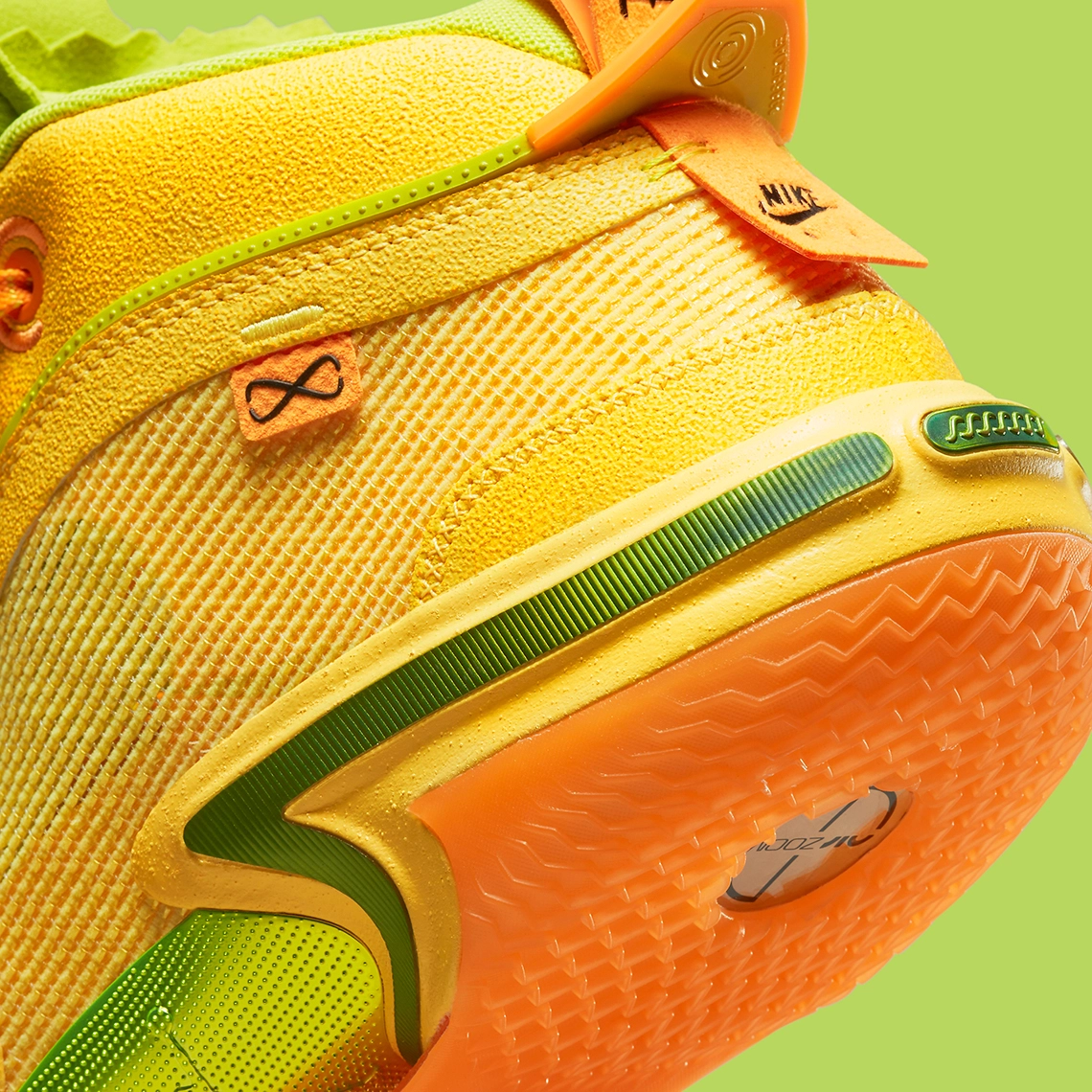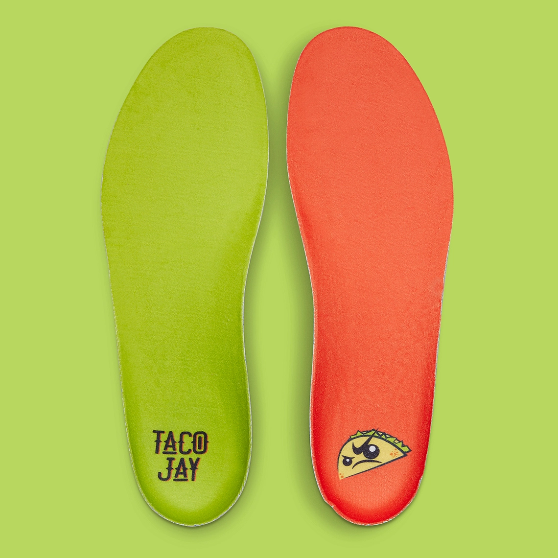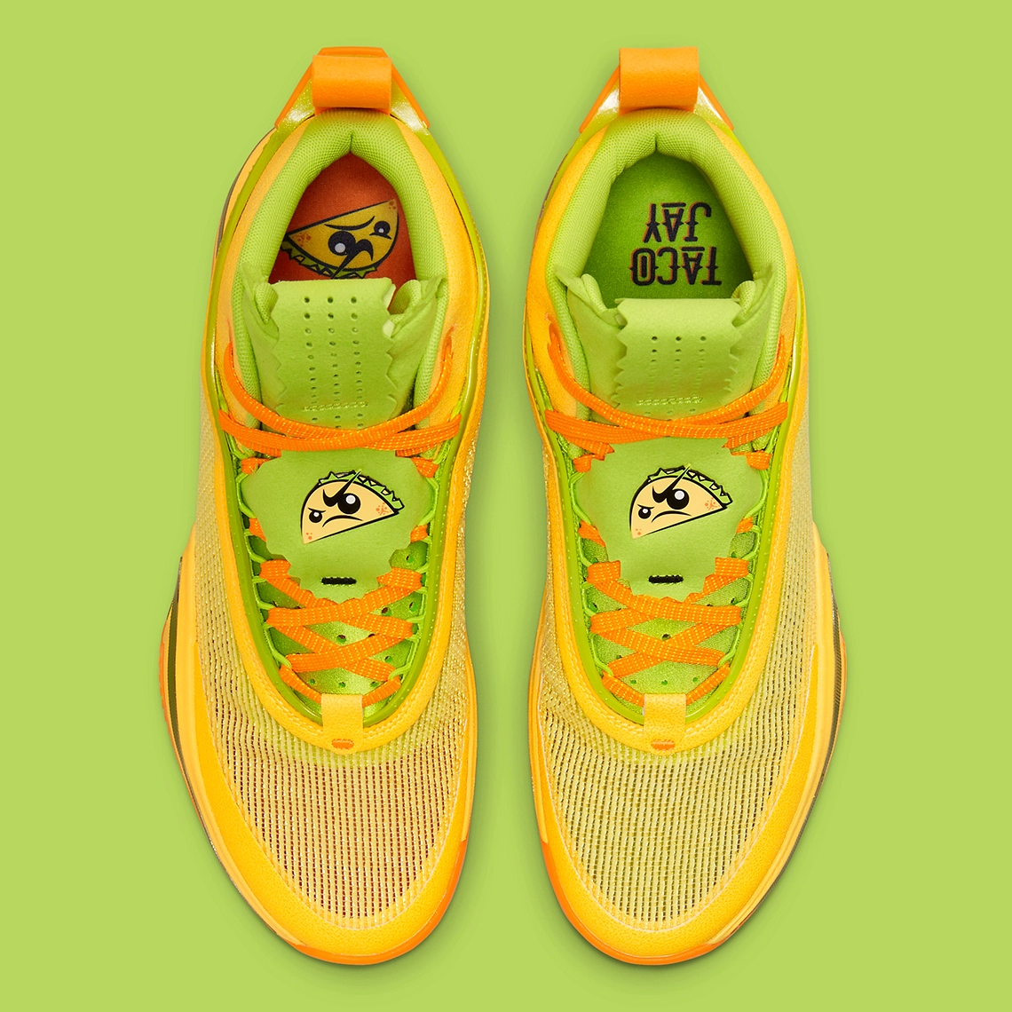 La tige est principalement jaune comme la couleur de la tortilla utilisée pour enrouler le taco, et l’ensemble est assorti de vert, sur la languette et le ruban traversant la semelle intermédiaire notamment, et d’orange, sur la semelle extérieure, la tirette et les lacets. Le logo « Taco Jay » ressort sur les lacets et est également présent sur la semelle intérieure droite.