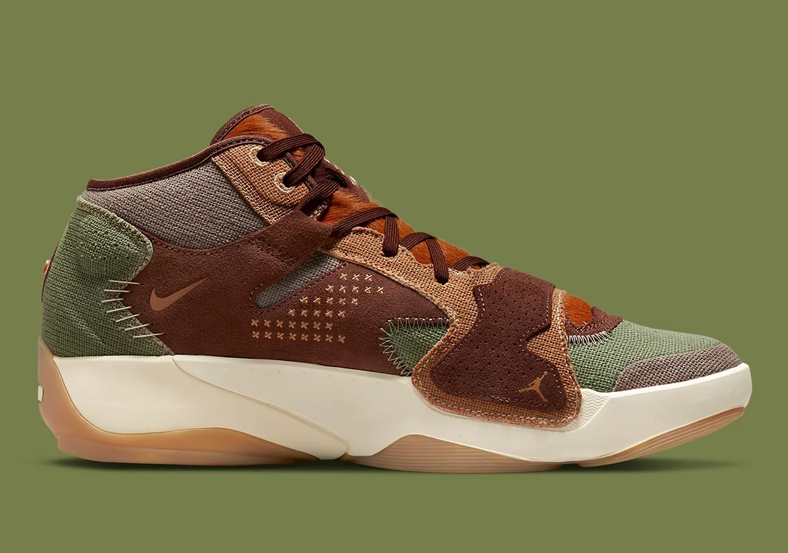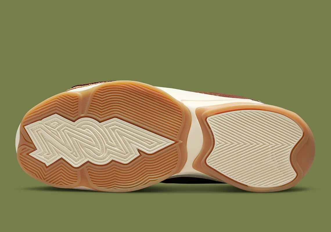 Ce premier coloris offre des touches marron-beige à du vert pâle et du gris tandis que la semelle ressort en blanc et beige.