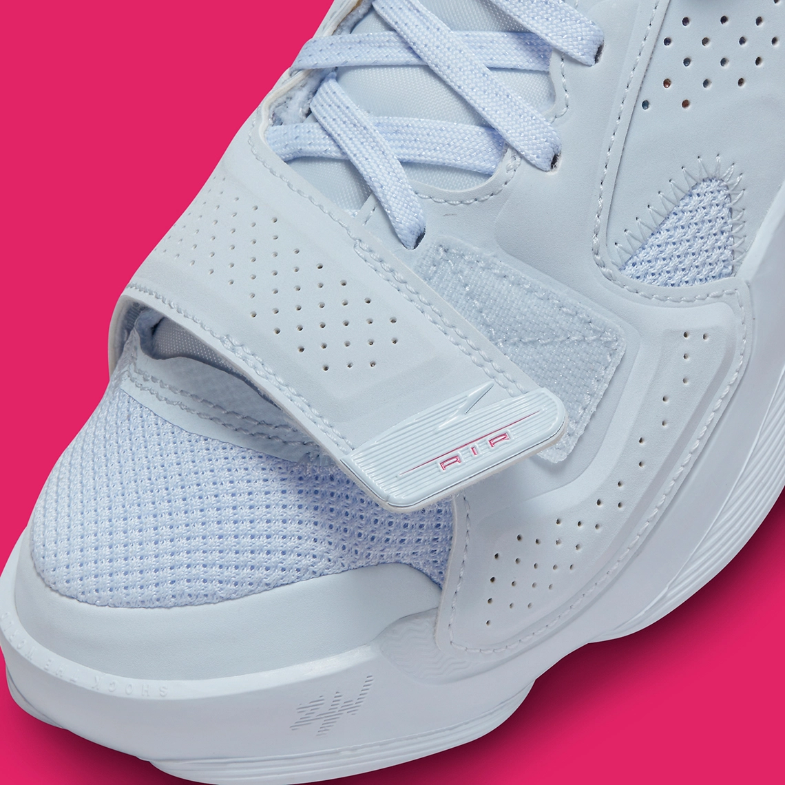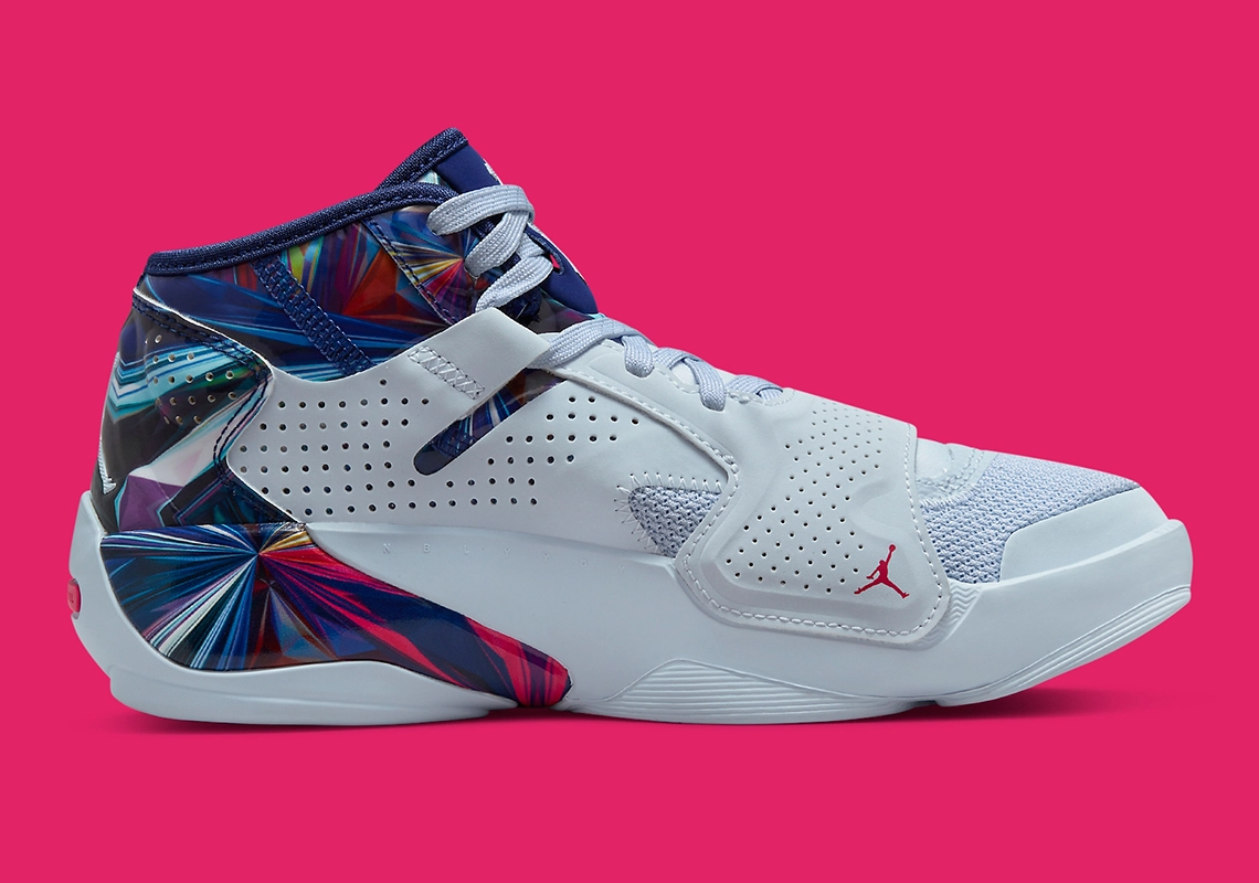 Sa composition est plus classique, avec une tige grise à l’avant entre mesh et cuir, et une partie multicolore pour assurer le contraste à l’arrière de la paire. Un « Jumpman » apparaît en rouge sur l’avant de la chaussure, en gris à l’arrière. À noter également les touches de rose au bas du talon et sous la semelle extérieure.