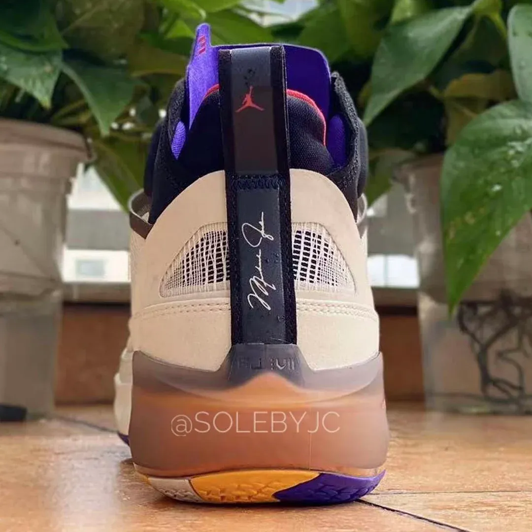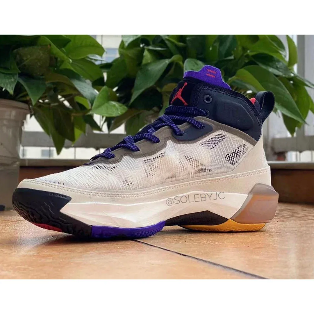 Celui-ci se présente avec une tige en tissage Leno blanc, complétée par une partie supérieure en noire et gris avec des notes de violet et de rouge, notamment pour faire ressortir le « Jumpman » sur la languette. La semelle, bien différente de la Air Jordan 36, est principalement noire, assortie de touches de violet, rouge et jaune.