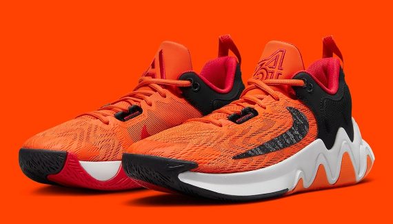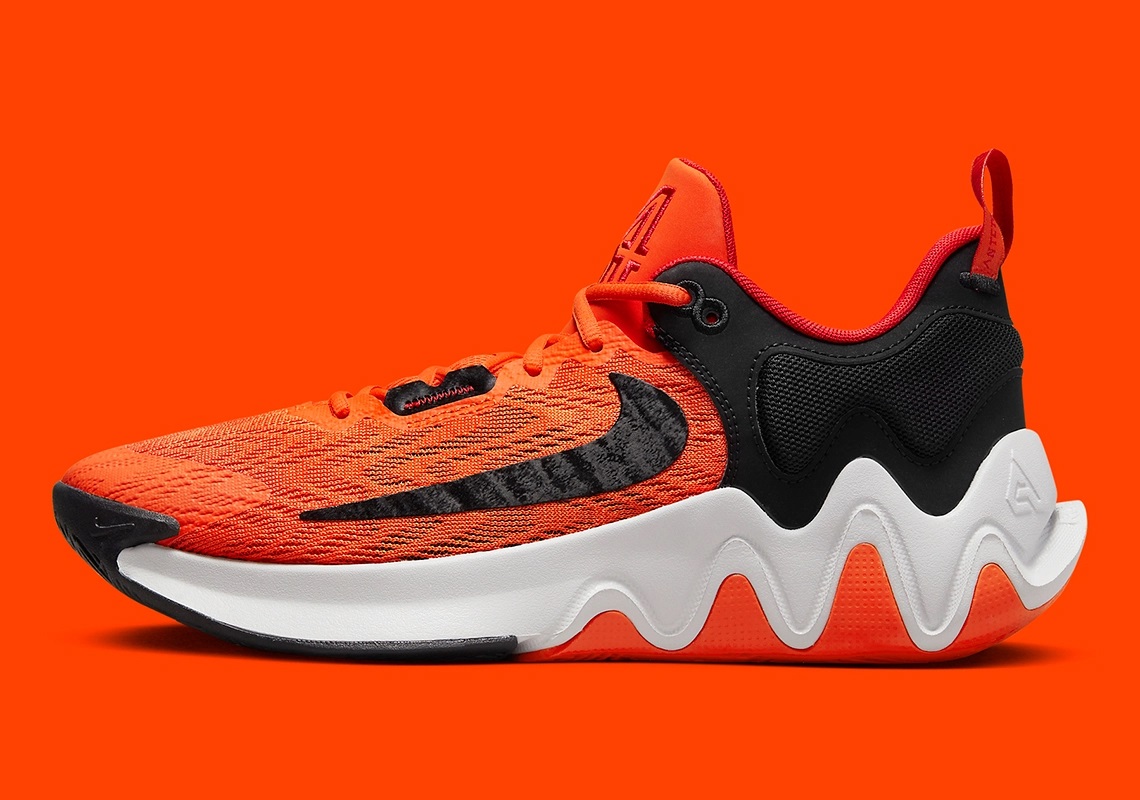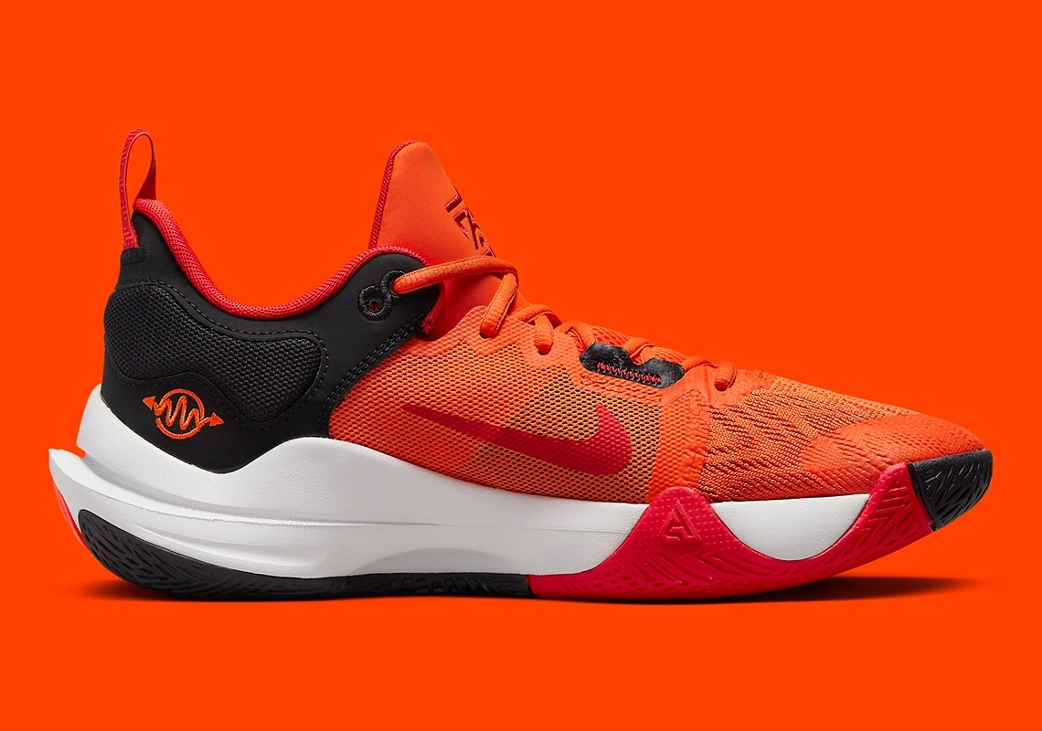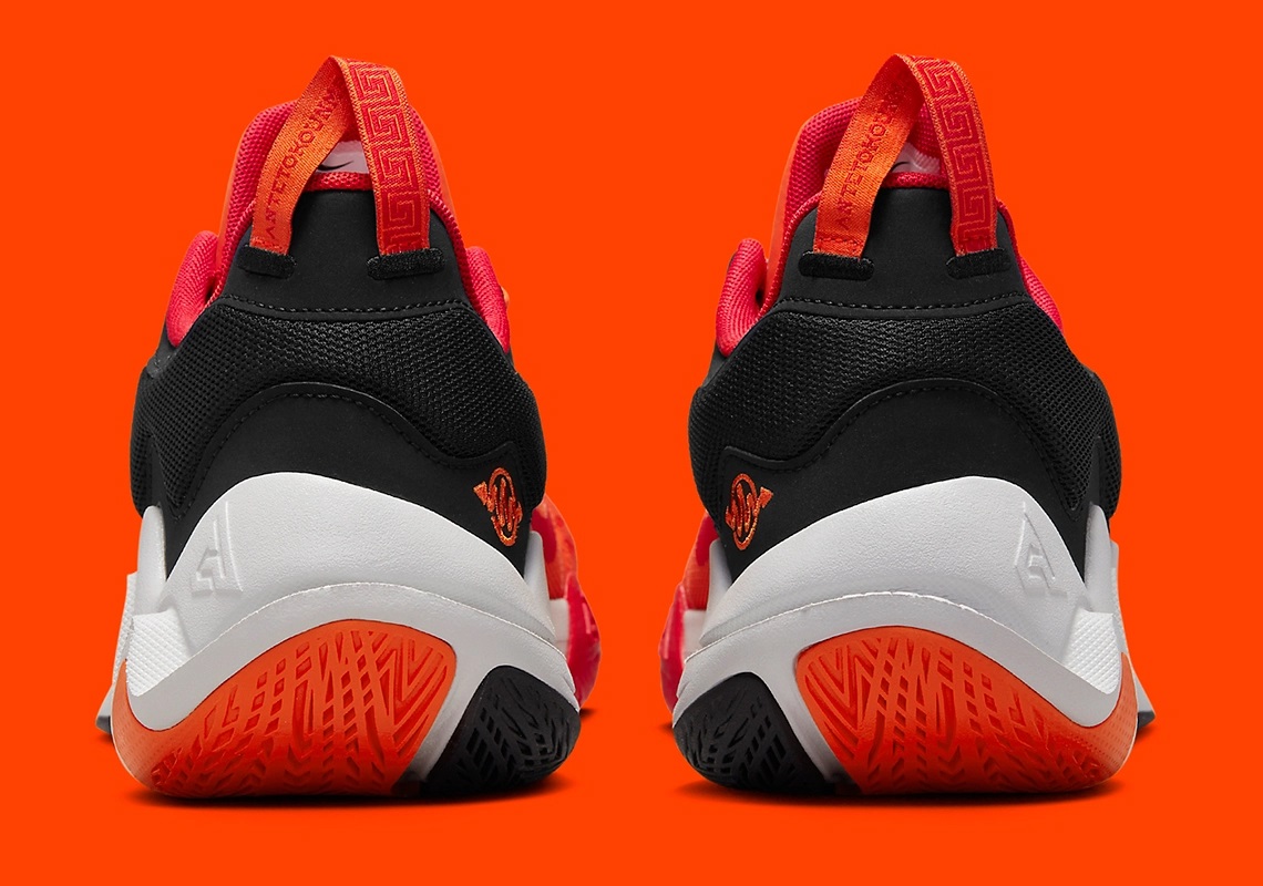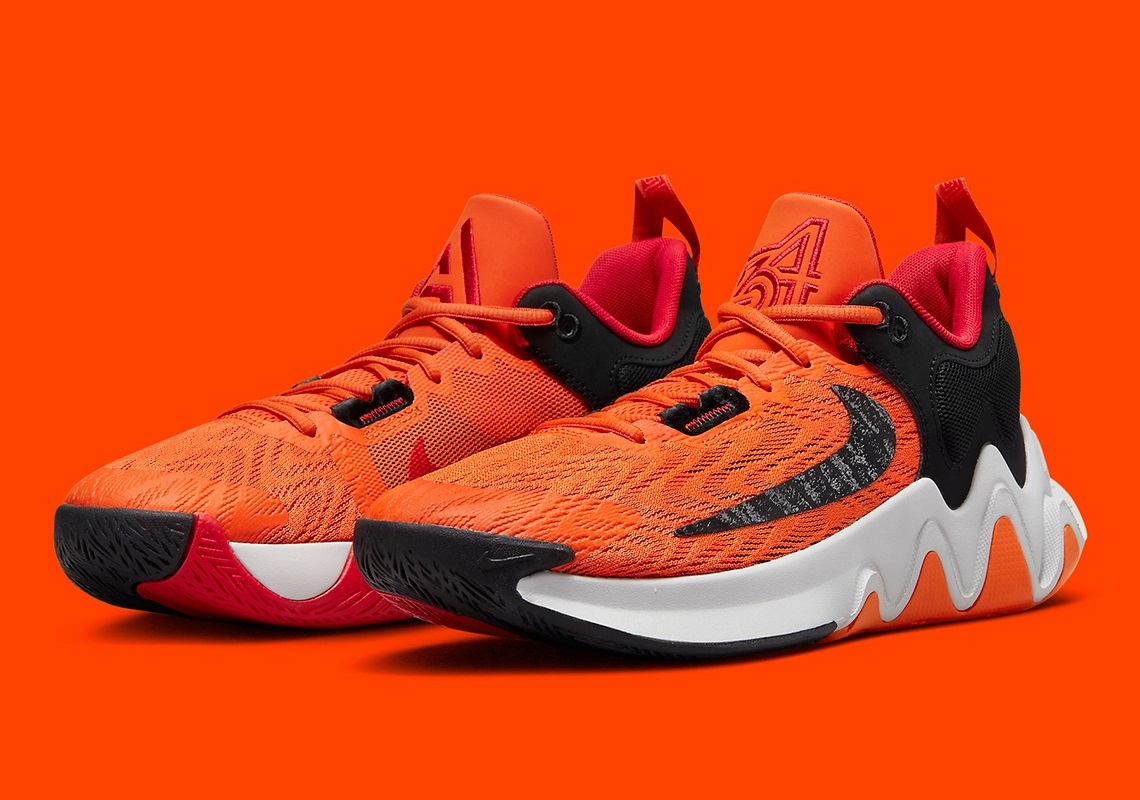 L’avant de la tige en mesh est en orange, l’arrière est en noir, avec une virgule rouge d’un côté et un « Swoosh » inversé noir de l’autre. D’autres touches de rouge complètent l’ensemble, comme sur les logos « A » et « 34 » sur la languette. La semelle intermédiaire blanche repose sur une semelle extérieure en orange, rouge et noir.