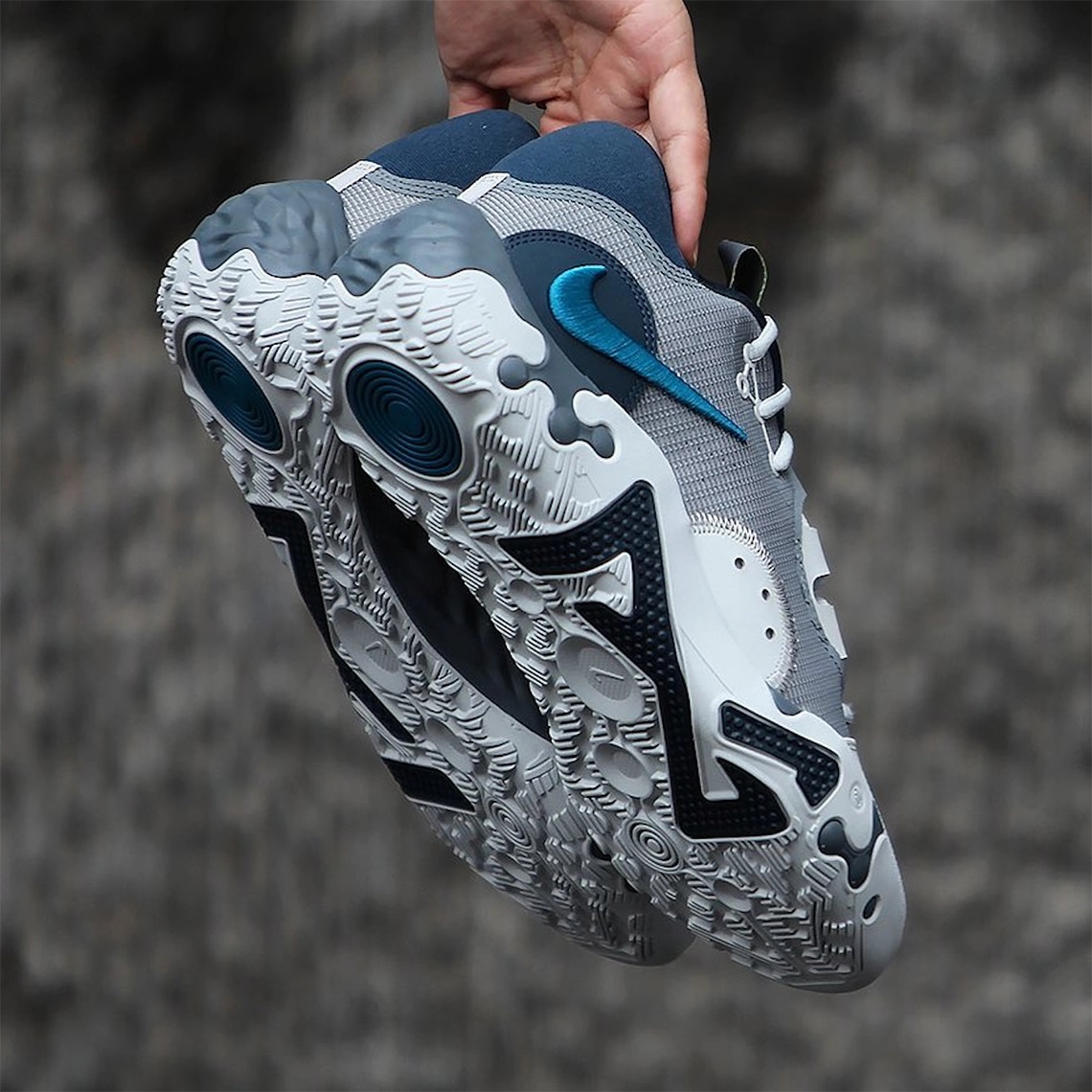 La majeure partie de la tige en mesh apparaît en gris, avec du blanc à l’avant et du bleu marine au niveau du talon. La semelle opte pour le même code couleur, avec la mousse Nike React en gris au niveau intermédiaire, et une majeure partie blanche sur la semelle extérieure.
