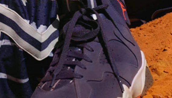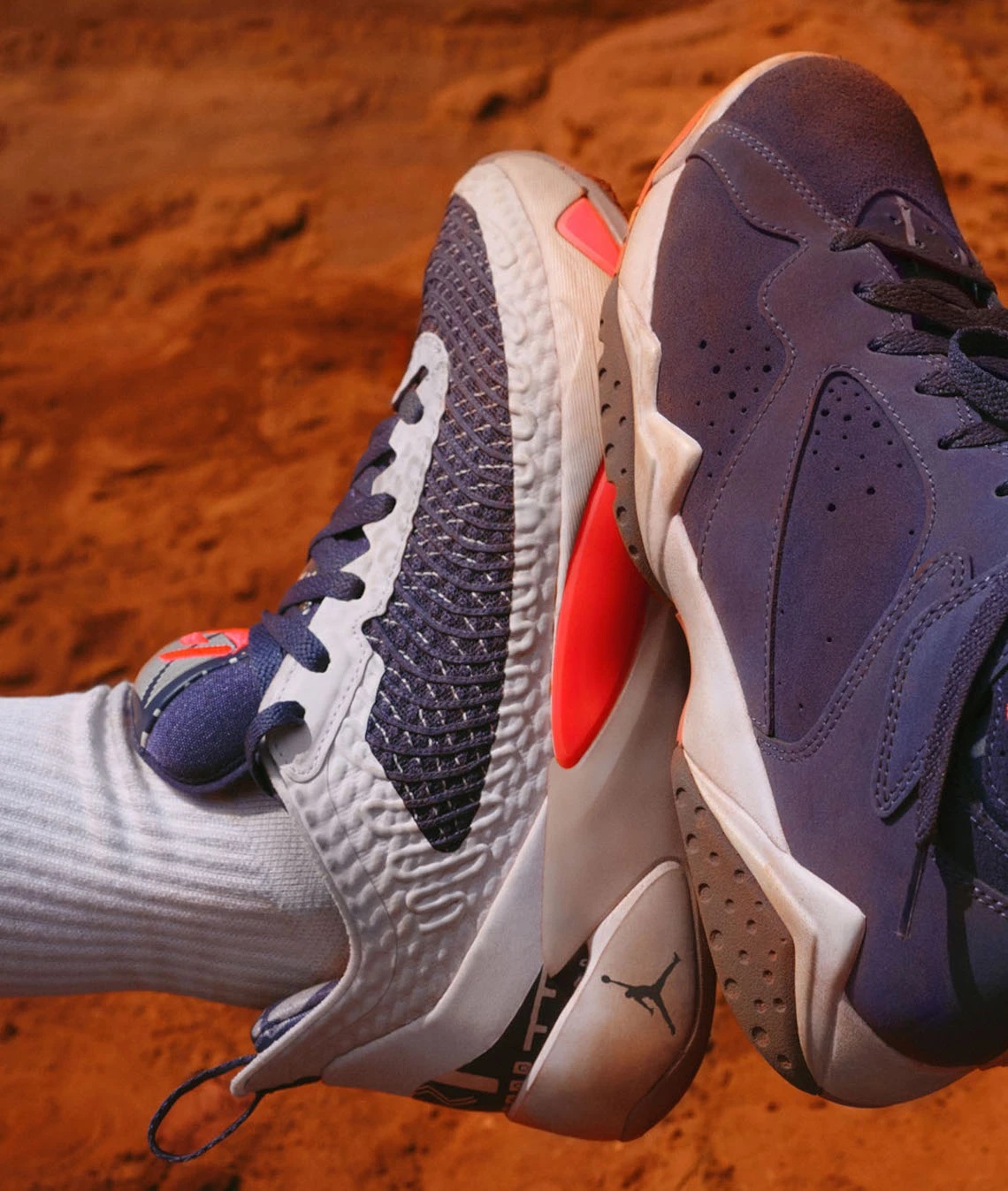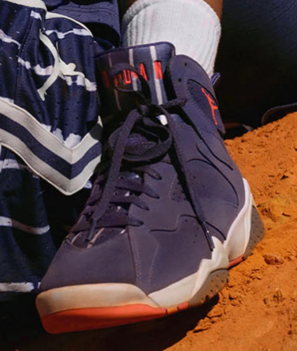 Sur ces quelques clichés, la Air Jordan 7 semble principalement articulée autour du bleu marine, avec des notes de blanc et d’orange. Un coup d’œil furtif à la Luka 1 permet d’apprécier un nouveau coloris aux codes similaires à la AJ7. La Air Jordan 1 Mid est pour sa part entièrement blanche.