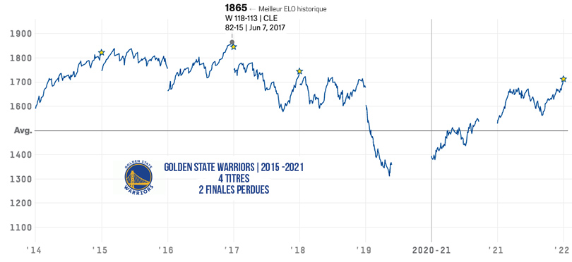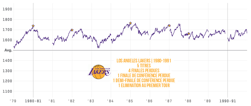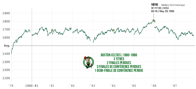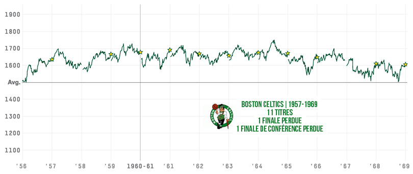 En prenant en considération la formule ELO (comme aux échecs), calculée par FiveThirtyEight, on constate par exemple que les Celtics des années 1960, les Lakers et Celtics des années 1980, les Bulls des années 1990 ou les Spurs des années 2000 n’ont jamais vraiment faibli sportivement sur la durée. Pour info, cette formule mesure la domination d’une équipe, en fonction des résultats de ses matchs (écarts de points dans les victoires/défaites), du niveau de l’adversaire et du lieu où est disputée la rencontre.