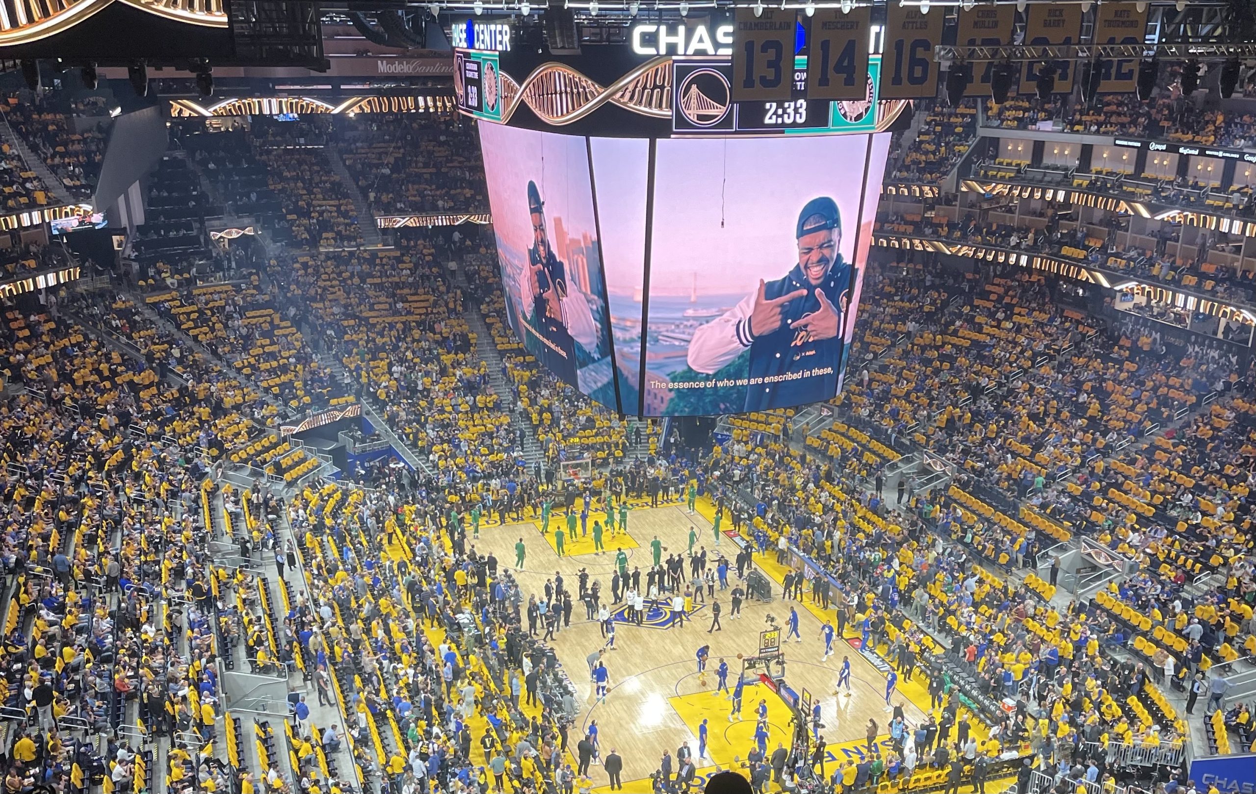 Les Warriors ont déménagé à San Francisco vers le Chase Center en septembre 2019. C’est là une salle flambant neuve, moderne et dernier cri, beaucoup plus aéré que le TD Garden. L’acoustique est bonne mais n’est pas comparable à celles des anciennes salles. Le Chase Center a souffert de la comparaison injuste avec le “Roaracle” mais est tout de même monté en puissance au cours des playoffs, terminant avec des fameux chants “Waaaaarrrriors” qui n’avaient pas à rougir de l’ambiance du TD Garden.