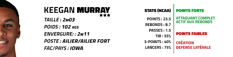 Troisième changement en quatre choix dans cette Mock Draft 2.0 : nous remplaçons Jaden Ivey par Keegan Murray pour ce 4e choix des Kings. Non pas car nous jugeons que l'ailier d'Iowa est un meilleur choix que l'ancien de Purdue, mais surtout car les dernières tendances à ce sujet semblent aller en ce sens.