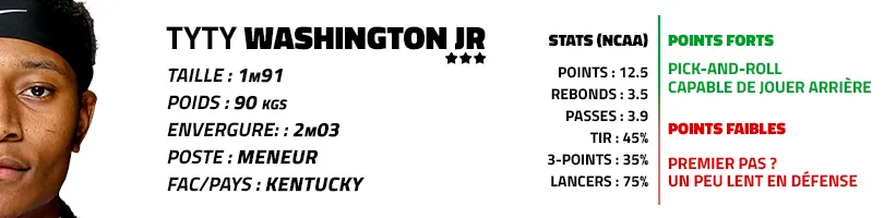 Les Knicks peuvent aussi continuer à piocher dans le réservoir Kentucky, qu’ils connaissent bien. Le choix de Tyty Washington Jr. ne serait pas dénué de sens, même si le meneur ferait finalement doublon avec Immanuel Quickley, sur lequel les Knicks comptent clairement. Mais sa maitrise du « pick-and-roll » serait un renfort utile à l’attaque des Knicks, qui a sévèrement manqué de créativité l’an passé.