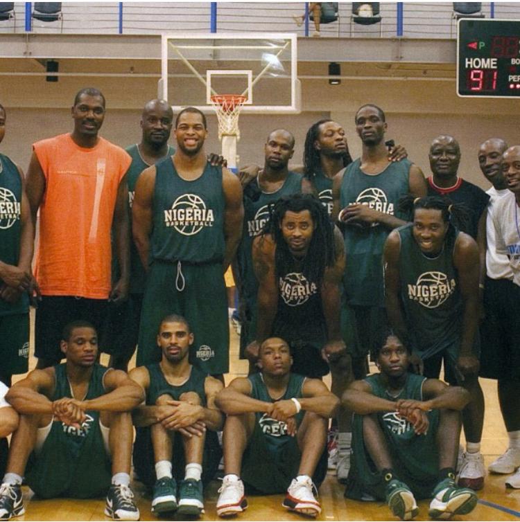 Derrick Obasohan et Ime Udoka, assis l’un à côté de l’autre, avec la sélection nigériane aux côtés d’Hakeem Olajuwon