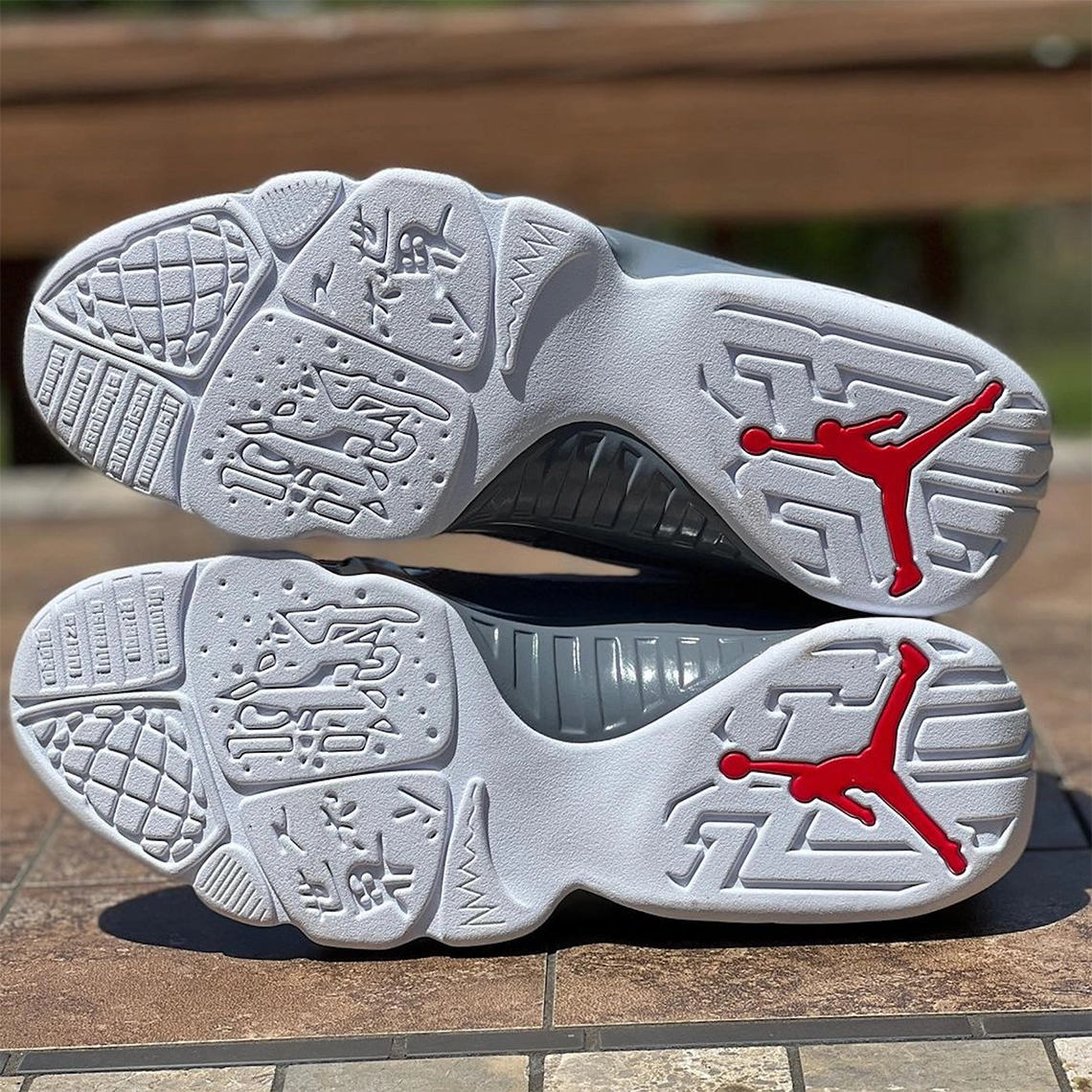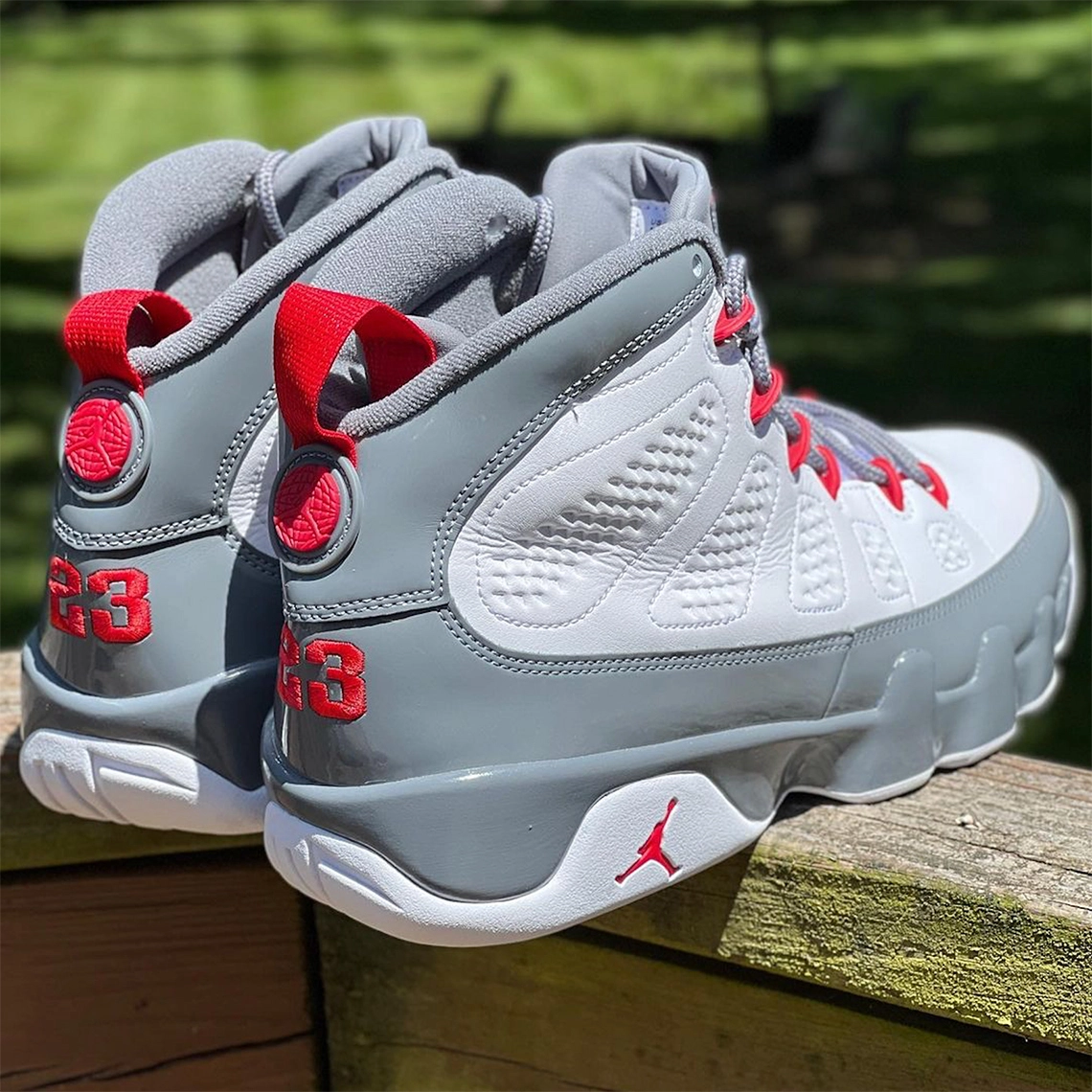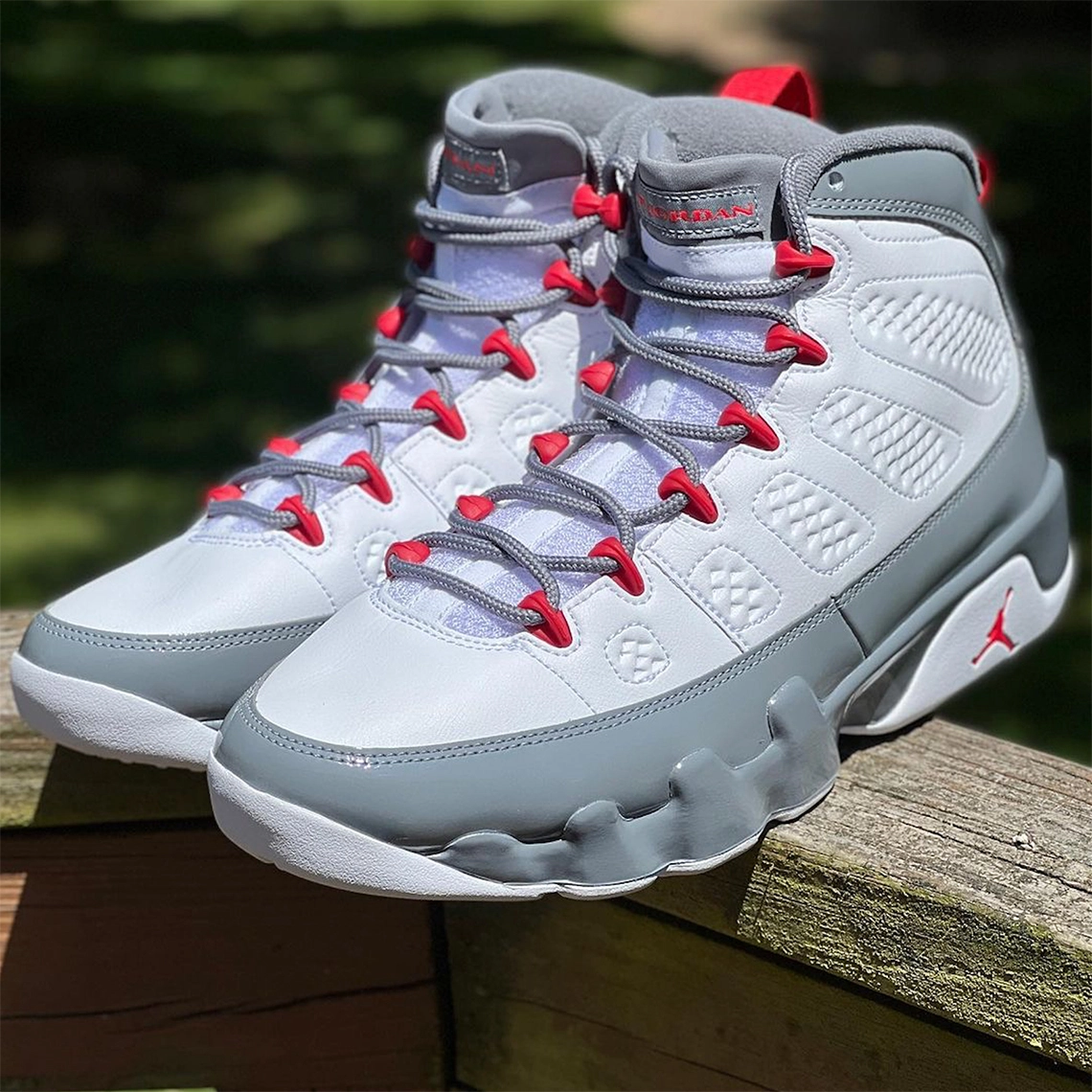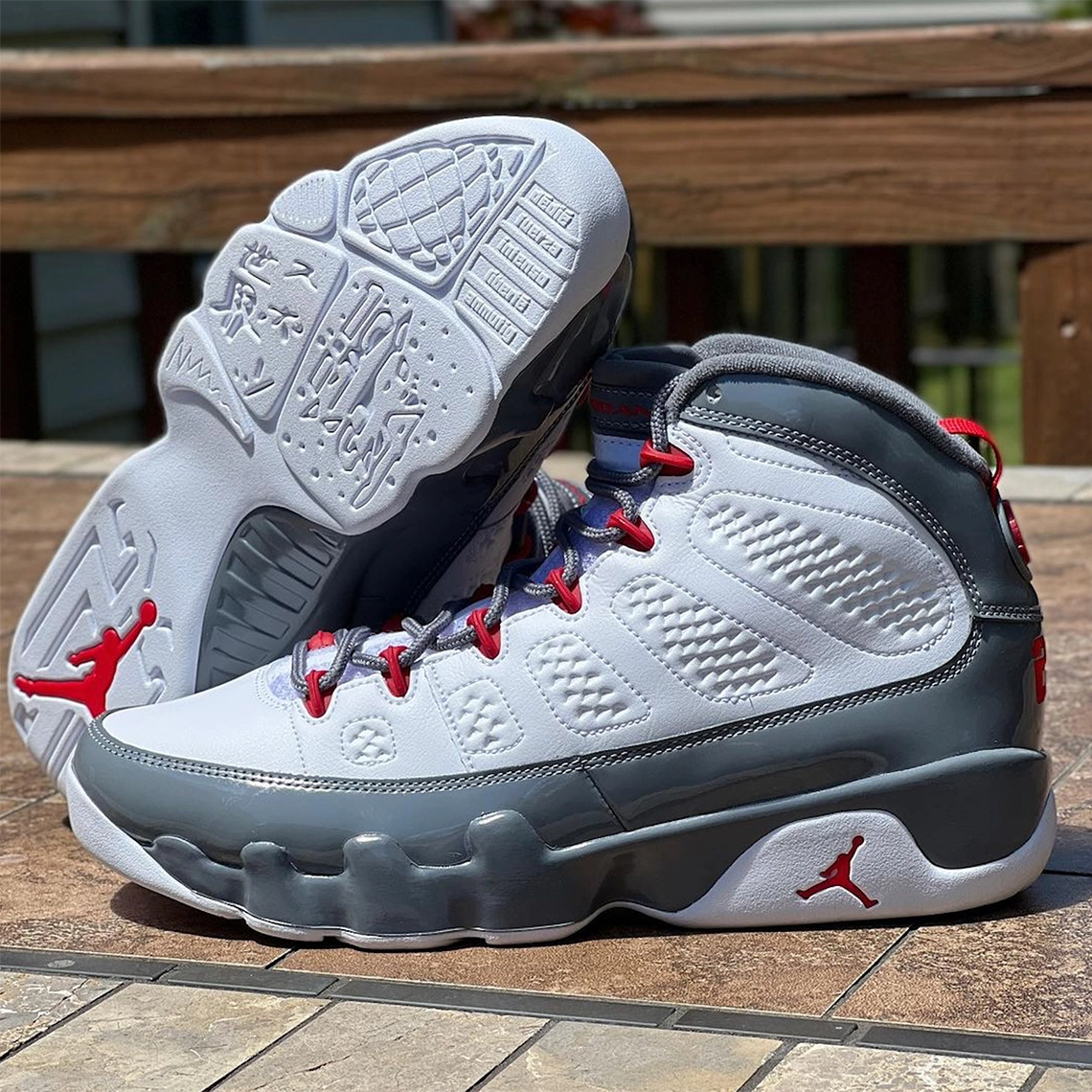 Après la Air Jordan 9 « Chile Red » et la « Particle Grey », Jordan Brand a tenté un mix en restant sur les mêmes tons avec cette AJ 9 « Fire Red ».
