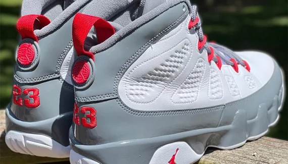 Après la Air Jordan 9 « Chile Red » et la « Particle Grey », Jordan Brand a tenté un mix en restant sur les mêmes tons avec cette AJ 9 « Fire Red ».