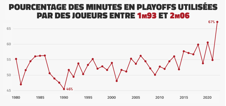 Le pourcentage de minutes utilisées en playoffs par des joueurs mesurant entre 1m93 et 2m06 n’a ainsi jamais été aussi élevé, à 67% contre 46% au début des années 1990.