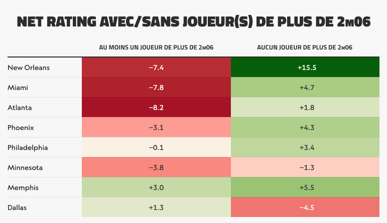 Ça reste encore à nuancer car Bam Adebayo fait par exemple 2m06 et Miami peut donc jouer “petit” sans vraiment faire de “small ball” alors que Dallas était la seule équipe à perdre en efficacité en jouant “petit” car leurs meilleurs groupes fonctionnaient avec un intérieur shooteur (Maxi Kleber, Davis Bertans…) de plus de 2m06.