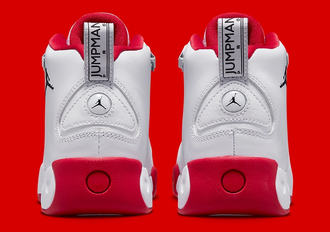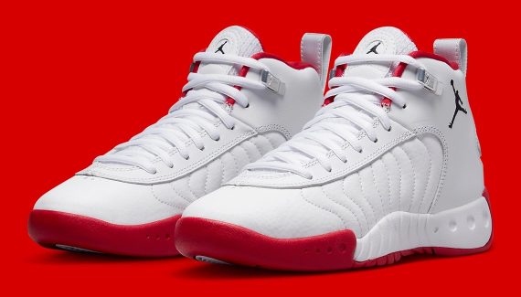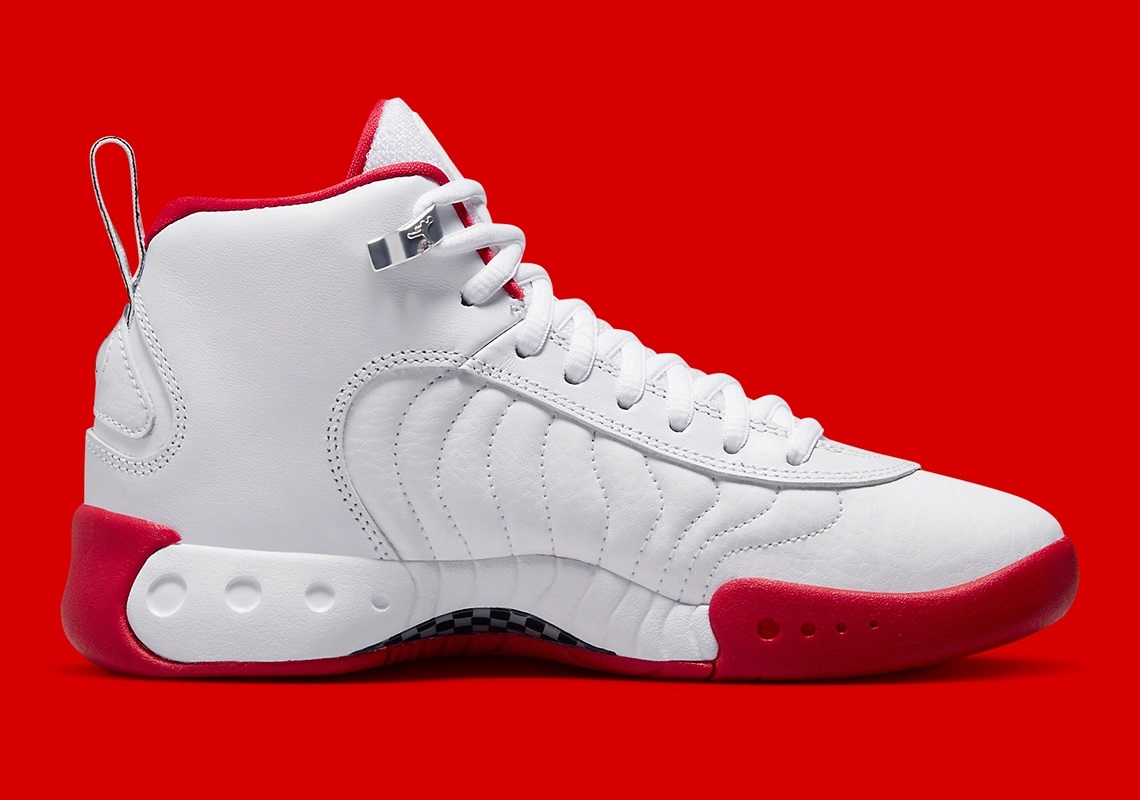 La tige principalement blanche fait ressortir le logo Jumpman sur le haut de la paire, la languette et le talon. L’intérieur du col et de la languette ainsi que la semelle extérieure en rouge complètent l’ensemble. On ne connaît pour l’heure ni son prix ni sa date de sortie.