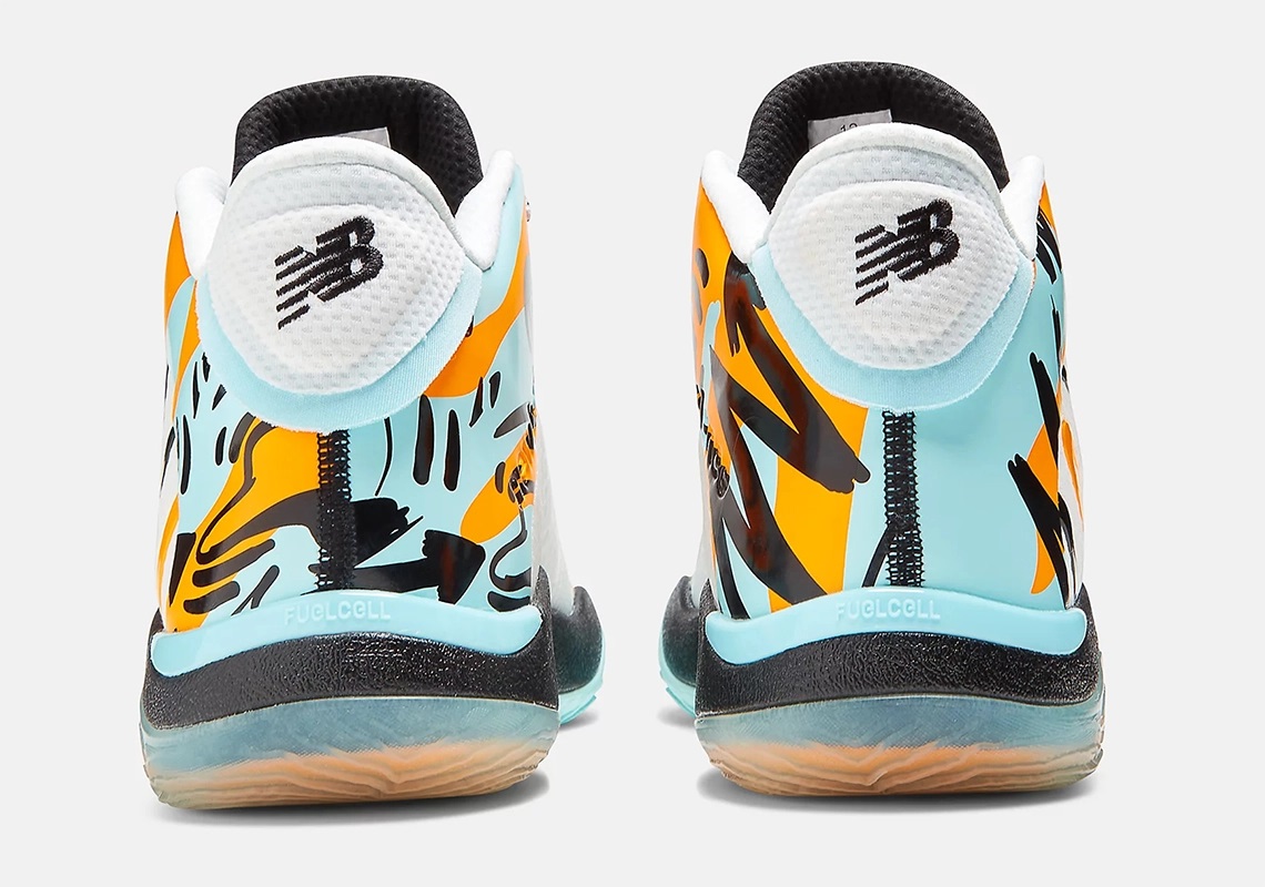 La tige en mesh blanc est complétée par des motifs en bleu clair, orange et noir sur le devant de la chaussure et au niveau du talon. Des pastilles en bleu et en orange sont présentent sur la languette blanche, tandis que le logo « New Balance » est bien visible en noir sur blanc sur le haut du talon.