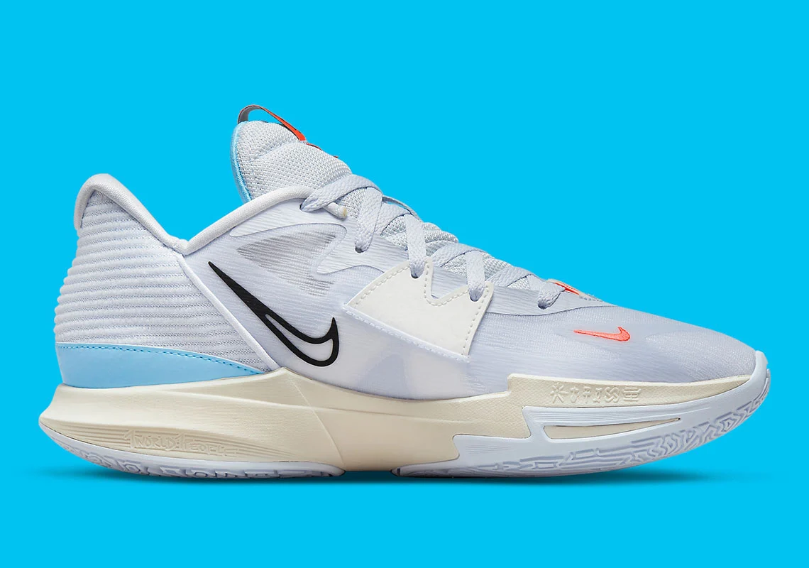 « City Edition », c’est sous cet angle qu’a été présenté la nouvelle Kyrie 5 Low, attendue en huit coloris pour 2022. L’idée fait sens puisque la paire reprend certaines des couleurs historiques de la franchise, avec des touches de bleu et de gris contrastées par des finitions en rouge-orange.