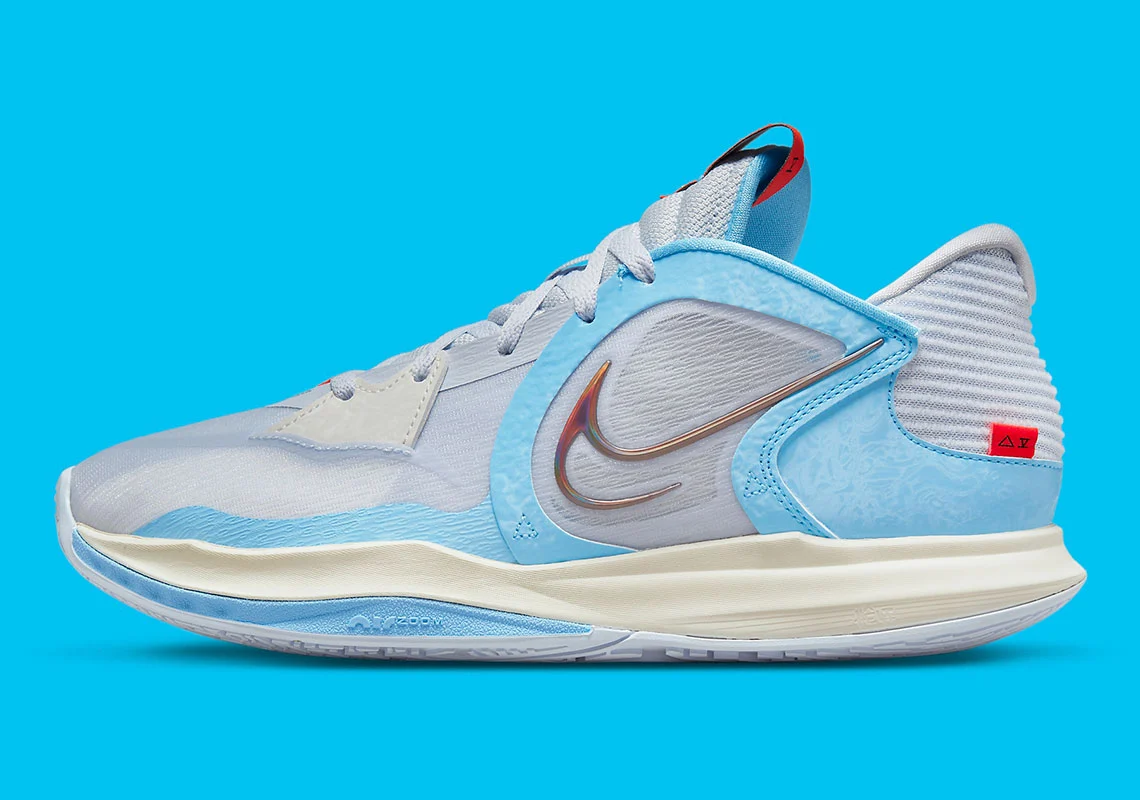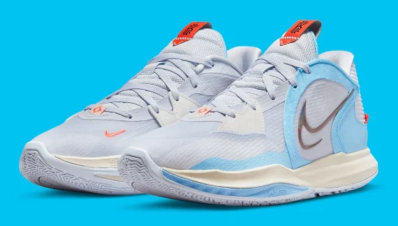 « City Edition », c’est sous cet angle qu’a été présenté la nouvelle Kyrie 5 Low, attendue en huit coloris pour 2022. L’idée fait sens puisque la paire reprend certaines des couleurs historiques de la franchise, avec des touches de bleu et de gris contrastées par des finitions en rouge-orange.