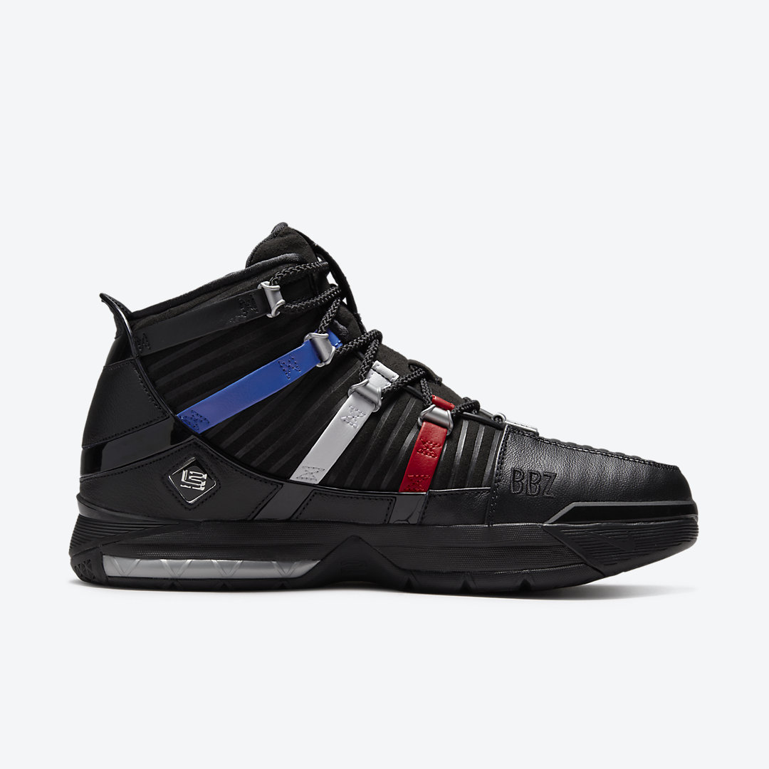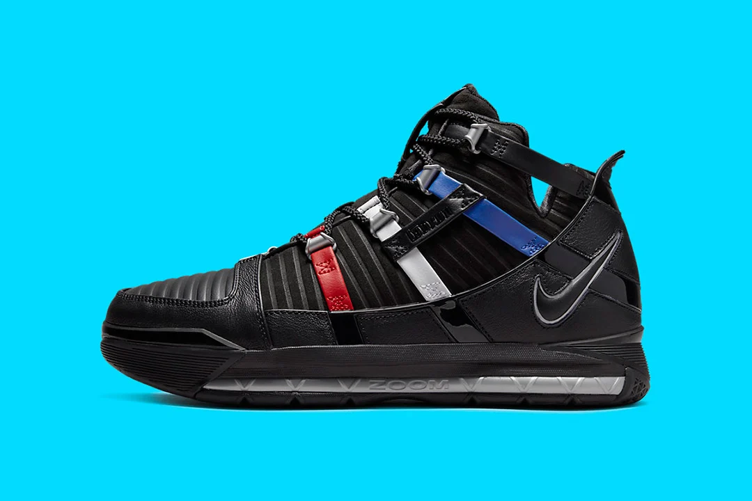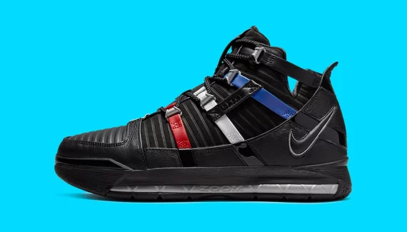 Retour aux sources pour Nike et LeBron James avec la sortie de la LeBron 3 en mode « Barbershop », un coloris qui fait ressortir trois bandes en bleu, blanc et rouge pour compléter une tige en nubuck noir couvert de superpositions de cuir noir. On retrouve également quelques finitions en gris, sur le logo du joueur ou les contours du « Swoosh ».